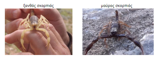 Στην Ελλάδα έχουμε δύο είδη σκορπιών, τον ξανθό και τον μαύρο. Στην χώρα μας δεν ζουν είδη σκορπιών τα οποία προκαλούν τον θάνατο του θύματος. Παρόλα αυτά εάν το θύμα υποστεί αλλεργικό σοκ, τότε μπορεί να προκληθεί και θάνατος.