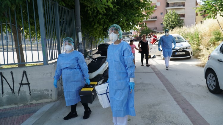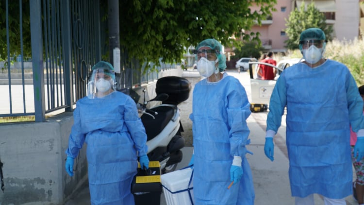 Συνεργεία του ΕΟΔΥ και των συναρμόδιων φορέων λαμβάνουν δείγματα από τα παιδιά, ενώ ενημερώνουν τους γονείς για την προβλεπόμενη διαδικασία.