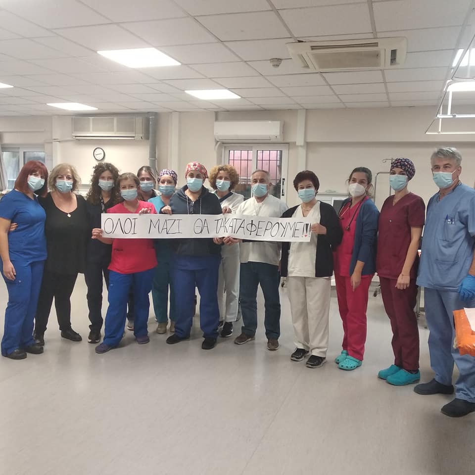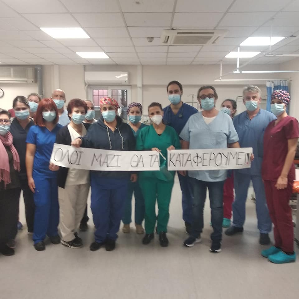 Γιατροί, νοσηλευτές και προσωπικό του Νοσοκομείο φρόντισαν σήμερα να στείλουν ένα απλό μήνυμα, αλλά γεμάτο δύναμη και αισιοδοξία: «Μαζί θα τα καταφέρουμε», ζητώντας και από όλους εμάς να τηρήσουμε τα μέτρα για να βοηθήσουμε ο καθένας μας στη μείωση της έντασης της πανδημίας…