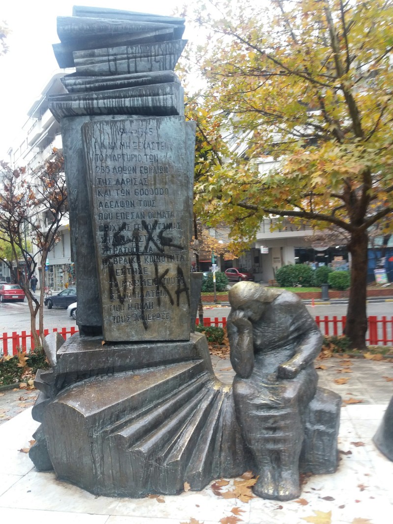 «Το απόγευμα της Πέμπτης 3/12/2020 στις 16:00′, ένας ρασοφόρος μέσης ηλικίας βεβήλωσε το Μνημείο Θυμάτων Ολοκαυτώματος στη Λάρισα. Κρατώντας μπροστά στο σώμα του μια θρησκευτική εικόνα, σχημάτισε με μαύρο σπρέυ το σύμβολο της φράσης «Ιησούς Χριστός Νικά» Στη συνέχεια σχεδίασε 2 φορές ακόμα το ίδιο σύμβολο στον τοίχο του περίβολου της Συναγωγής, που βρίσκεται αυτή την εποχή σε στάδιο αναστήλωσης.