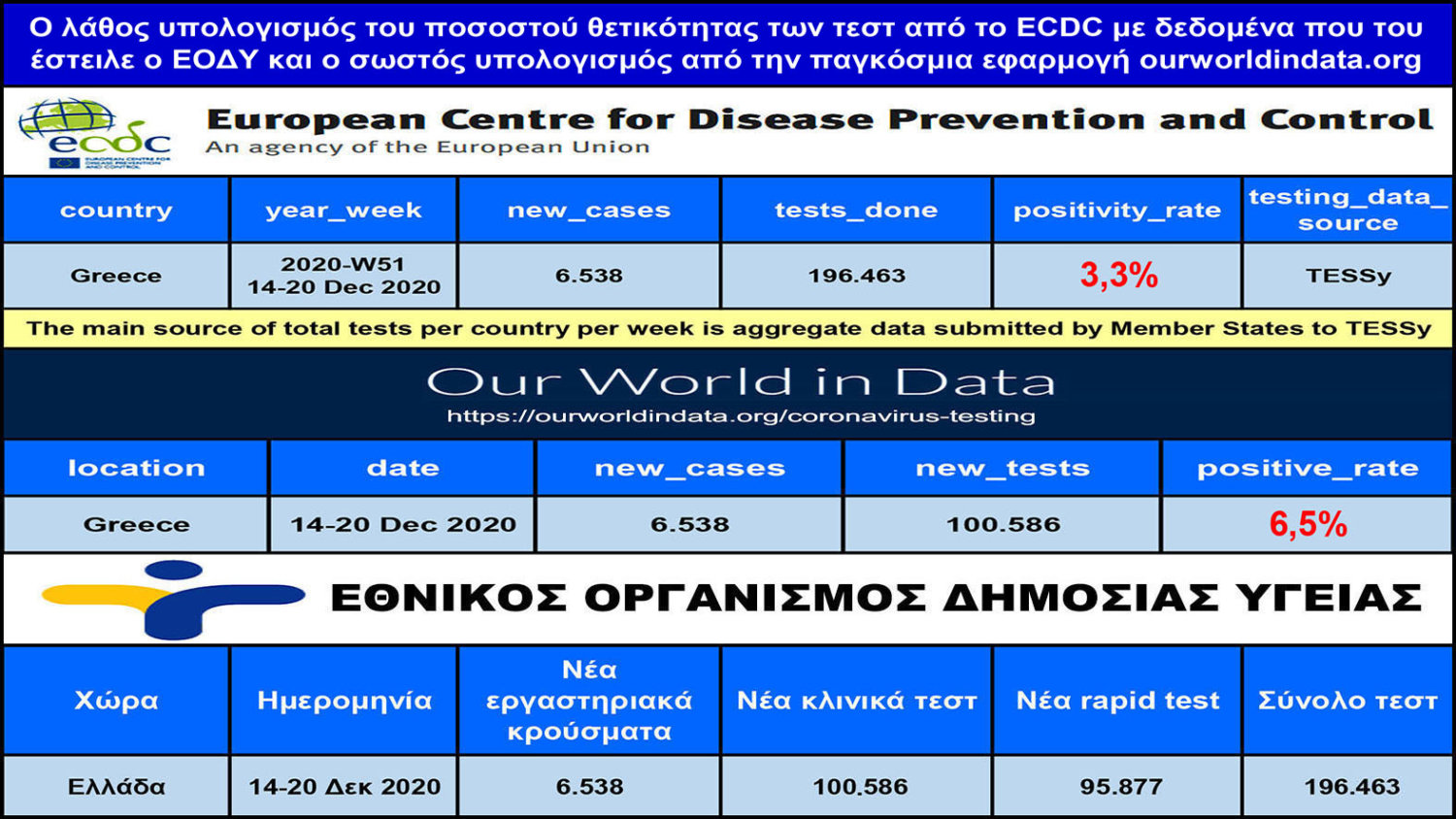 - Λάθος αποστολή δεδομένων του ΕΟΔΥ στοECDC: Στις 25.12.2020 υπήρξαν δημοσιεύματα των μεγάλων ΜΜΕ με τίτλο όπως «Κάτω από το 4% ο δείκτης θετικότητας των τεστ covid-19 στην Ελλάδα», «Πράσινη η Ελλάδα στον χάρτη θετικότητας του ECDC (Ευρωπαϊκό Κέντρο Πρόληψης και Ελέγχου Νόσων)», με κύρια πηγή το ΑΠΕ-ΜΠΕ, αλλά όταν ο ΕΟΔΥ στέλνει στο ECDC λανθασμένα δεδομένα και το ποσοστό θετικότητας των τεστ που υπολογίζει τοECDC θα είναι λανθασμένο. Όπως φαίνεται στον παρακάτω πίνακα τα κρούσματα που ανακοινώνει ο ΕΟΔΥ είναι εργαστηριακά επιβεβαιωμένα και δεν περιλαμβάνονται σε αυτά τα θετικά κρούσματα των rapidtest. ΣτοECDCόμως ο ΕΟΔΥ έστειλε, σύμφωνα με την έκθεση του ECDC,το σύνολο των κλινικών και rapid τεστ και όχι μόνο τα κλινικά τεστ, με αποτέλεσμα το ποσοστό θετικότητας των τεστ που υπολόγισε το ECDC να είναι 3,3%, ενώ το πραγματικό ποσοστό θετικότητας που υπολογίζεται από την παγκόσμια εφαρμογή org, η οποία χρησιμοποιεί μόνο τα κλινικά τεστ, είναι 6,5%. Και το ερώτημα είναι σε τι αποβλέπει ο ΕΟΔΥ παρουσιάζοντας στους ευρωπαίους εταίρους μας μία εικονική πραγματικότητα, να διασυρθεί και πάλι στατιστικά η χώρα μας; Αυτή είναι η Ελλάδα που θέλουμε και αξίζουμε;Επισημαίνεται ότι για το παραπάνω λάθος του ΕΟΔΥ έχω ενημερώσει τους αρμόδιους από τις 16.12.2020.
