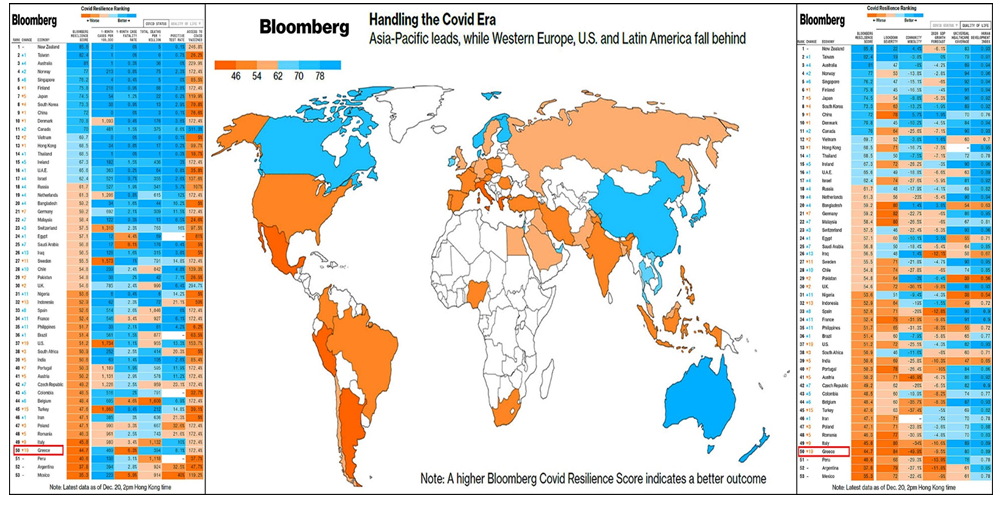 Στον παρακάτω χάρτη φαίνεται η θλιβερή εικόνα της χώρας μας παγκοσμίως σύμφωνα με την πρόσφατη αξιολόγηση του Bloomberg, όπου λαμβάνονται υπόψη οι εξής 10 παράμετροι: