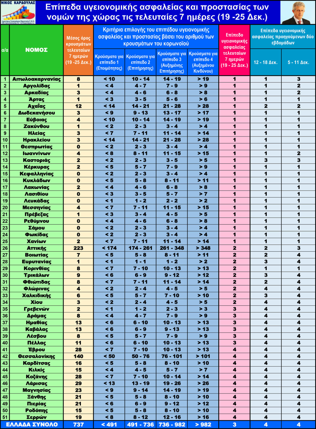 - Συνολικά 28 νομοί από τους 51 νομούς της χώρας (55%) βρίσκονται στα επίπεδα 1 και 2 επί δύο εβδομάδες από τις 12 έως τις 25 Δεκεμβρίου, οι νομοί Αιτωλοακαρνανίας, Αργολίδας, Αρκαδίας, Άρτας, Αττικής, Αχαΐας, Βοιωτίας, Δωδεκανήσου, Εύβοιας, Ζακύνθου, Ηλείας, Ηρακλείου, Θεσπρωτίας, Ιωαννίνων, Κέρκυρας, Κεφαλληνίας, Κορινθίας, Κυκλάδων, Λακωνίας, Λασιθίου, Λευκάδας, Μεσσηνίας, Πρέβεζας, Ρεθύμνου, Σάμου, Φθιώτιδας, Φωκίδας και Χανίων, ενώ 23 από τους παραπάνω νομούς βρίσκονται στα επίπεδα 1 και 2 επί τρεις εβδομάδες.