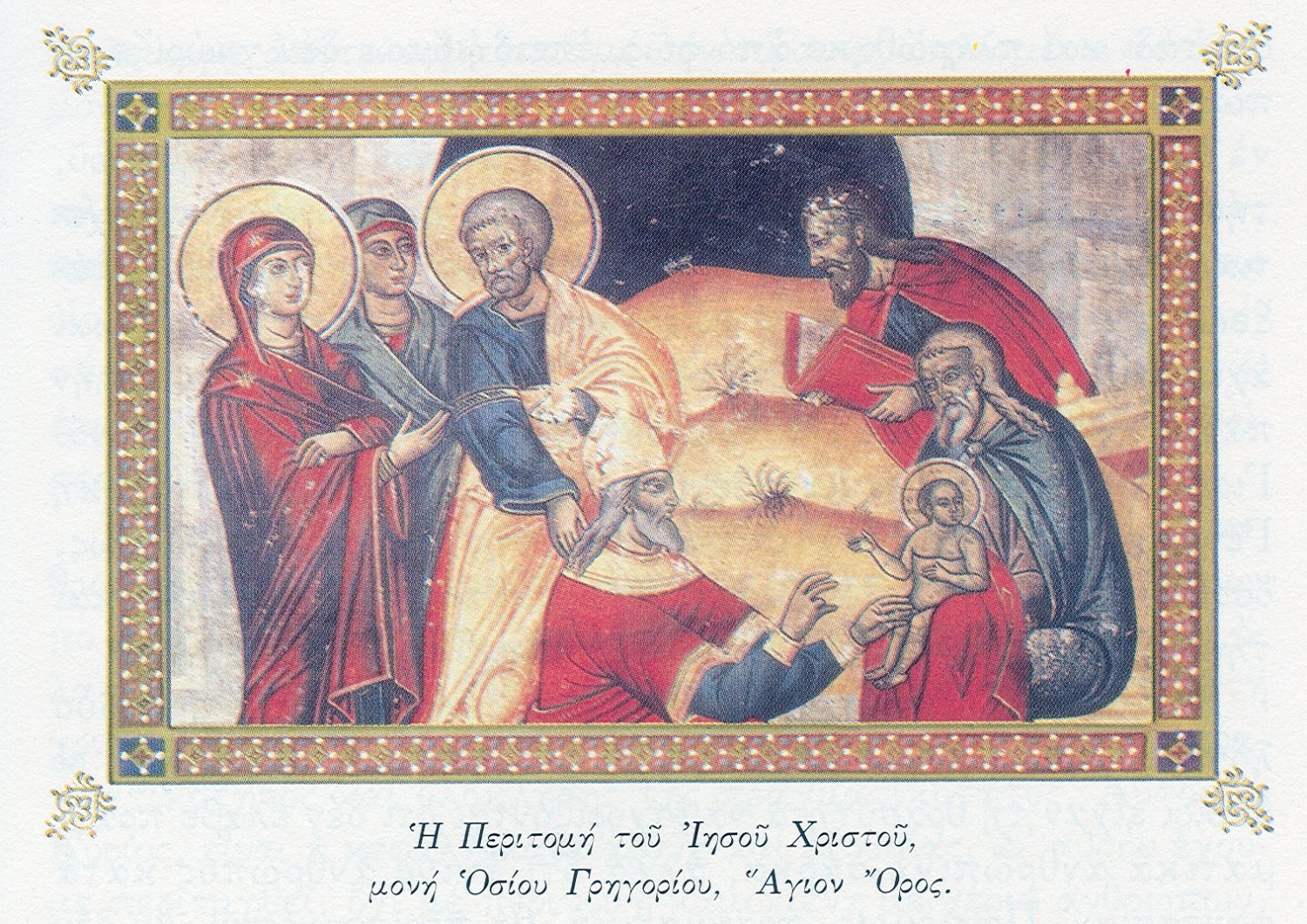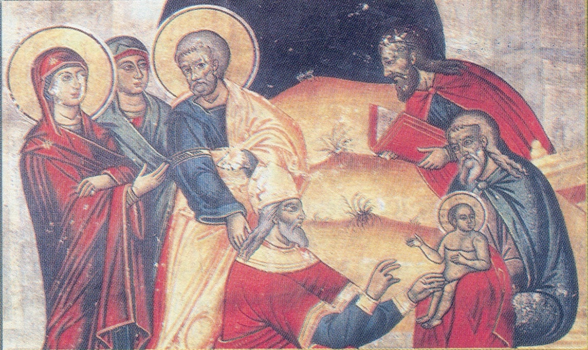 Η ΠΕΡΙΤΟΜΗ ΤΟΥ ΚΥΡΙΟΥ: Η περιτομὴ του βρέφους Ιησού έγινε στὴ Συναγωγὴ τῆς Βηθλεέμ. (Λουκ. 2, 5). Το Θείο Βρέφος, αφού γεννήθηκε με τον Παλαιὸ Νόμο, έπρεπε νὰ υποβληθεί και Αυτὸ στον τύπο, ο οποίος έπρεπε να ισχύει μέχρι την κατάργησή του. Ο Απόστολος Παύλος λέει σχετικά: “ότε δὲ ήλθε το πλήρωμα του χρόνου, εξαπέστειλεν ο Θεὸς τον υιὸν αυτού, γενόμενον εκ γυναικός, γενόμενον υπὸ νόμον, ίνα τους υπὸ νόμον εξαγοράση, ίνα τὴν υιοθεσίαν απολάβωμεν” (Γαλ. δ΄4,5). Η περιτομή συνοδευόταν και με την ονοματοδοσία του βρέφους. Το ίδιο συνέβη και με το Θείο Βρέφος που του δόθηκε το όνομα Ιησούς που είναι ελληνικός όρος από το Εβραϊκό Γεσούα. Είναι το ίδιο με το όνομα «Εμμανουήλ» που αναφέρει ο Ησαΐας, και σημαίνει «ο Θεός είναι μαζί μας». Ο Απόστολος Παύλος προσθέτει πως οι πιστοί περιετμήθησαν με περιτομὴ πνευματική, ενεργούμενη απ᾿ το Αγιο Πνεύμα. Και αυτή συνίσταται στο γδύσιμο και την αποβολὴ του σώματος, που δούλεψε στις αμαρτίες. Το γδύσιμο αυτὸ, έλεγε, είναι η περιτομή, που πήραν απὸ τον Χριστό, όταν θάφτηκαν μαζί Του, διά του Αγιου Βαπτίσματος.