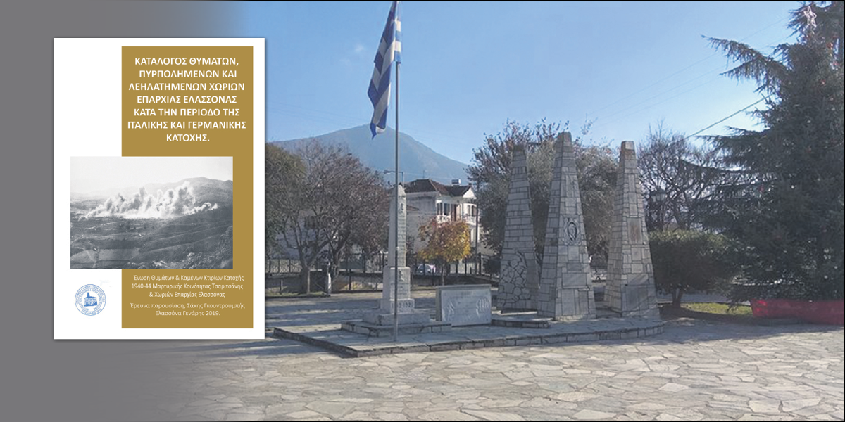Ελασσόνα. Βομβαρδίστηκε πριν το Πάσχα του 1941. Θύματα στην κατοχή: Αλεξούλη Μαρία του Γεωργίου 18 ετών 1944, Αλεξούλης Ηλίας 1943, Αλέτρης Κωνσταντίνος (Κωτσούλας) 1943, Βελέτζας Χαρίλαος, Βουρονίκος Θανάσης 1941 (βομβαρδισμούς), Γκανάτσιος Νίκος 1941 (βομβαρδισμούς), Δαλδόγιαννος (σύζυγος Δαλδόγιαννου Μαρίας) 1941 (βομβαρδισμούς), Κυριακού Λευτέρης, Λαφαζάνης Ιωάννης 1944, Μεταξιώτης Δημήτρης, Μπακαγιάννης Μιχάλης (φοιτητής με αντιστασιακή δράση, εκτελέστηκε στις 22/8/44 στη Ραψάνη), Μπακογιάννης Πάυλος, Νατσιούλης Νίκος 1944, Παιδής Αθανάσιος 1941 (βομβαρδισμούς), Πακάκης Άγγελος 1941, Παπαθανασίου Ιωάννης, Παπασάρρος Νεόφυτος 1944 (κατά κόσμον Σάρρος Νικόλαος), Σαμαράς Β. Ηλίας 9 ετών από νάρκη 11/1943, Σαπουνάς Ευάγγελος 1944, Σαπουτζόπουλος Βασίλειος, Σκοτίδας Χρήστος 1941 (βομβαρδισμούς), Τζημαγεώργης Γεώργιος (Μπανούσης) 1943, Τσαβές Θεόδωρος, Τσιρογιάννης Κωνσταντίνος, Τζιτζιμπίμης Γιάννης, Χατζηπατέρα Ευαγγελία, Χατζηπατέρας Δημήτριος, Θανασάκης, μικρό παιδί σκοτώθηκε το 1941 από τους βομβαρδισμούς (περιγραφή Β. Χουρίδη).