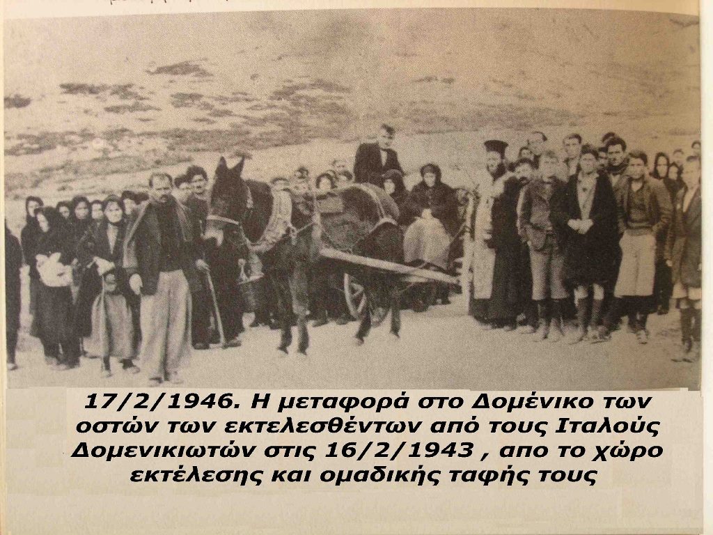 Δομένικο. Λεηλατήθηκαν όλα τα σπίτια του χωριού και πυρπολήθηκαν 120 κατοικίες, εκτελέστηκαν στις 16/2/1943: Βαρσαμής Βασίλειος Δημητρίου, Βαρσαμής Γεώργιος Κωνσταντίνου, Βαρσαμής Κωνσταντίνος Γεώργιος, Βασιλειάδης Χαράλαμπος, Βέρρας, Αστέριος Ιωάννης, Γεωργάκης Σπύρος Γεωργίου, Γεωργιάδης Πέτρος Αλεξίου, Γούλας Βασίλειος Αντώνιου, Γούλας Ιωάννης Παντελή, Δεληγιαννίδης Στυλιανός Ευσταθίου, Δερνίκας Αθανάσιος Τριαντάφυλλου, Δισακκόπουλος Νικόλαος Γεωργίου, Δισακκόπουλος Γεώργιος Νικολάου, Ευαγγελιάς Θωμάς Δημητρίου, Ζάγκας Αθανάσιος Θεοχάρη, Ζάγκας Βασίλειος Δημητρίου, Ζάγκας Γεώργιος Ιωάννη, Ζάγκας Δημήτριος Ιωάννη, Ζάγκας Ευάγγελος Ιωάννη, Ζάγκας Θωμάς Ιωάννη, Ζάγκας Κωνσταντίνος Δημητρίου, Καλαμποκίνης Αναστάσιος Ζήση, Καμιλης Παναγιώτης Γεωργίου, Καραγιάννης Ευάγγελος Ιωάννη, Καραγιάννης Ηλίας Σπύρου, Καραίσκος Ιωάννης, Καραμήτρος Θωμάς Νικολάου, Καραμίντζας Αθανάσιος Βασιλείου, Καραμίντζας Θεόδωρος Γεωργίου, Καραμίντζας Αστέριος Αθανασίου, Καρανίκας Αθανάσιος Θωμά, Καρανίκας Θωμάς Τριαντάφυλλου, Καρανίκας Νικόλαος Ιωάννη, Καρέλας Δημήτριος Ιωάννη, Καρέλας Αθανάσιος Δημητρίου, Καφανέλλης Αλέξιος Βελισσαρίου, Καφανέλλης Βελισσάριος Δημητρίου, Καφανέλλης Στέφανος Κωνσταντίνου, Καφανέλλης Χρηστός Δημητρίου, Κιάτος Ευάγγελος Ιωάννης, Κιάτος Θεοφάνης Ιωάννη, Κιάτος Ιωάννης Ευαγγέλου, Κιάτος Παύλος Ιωάννη, Κολτσίδας Αστέριος Κωνσταντίνου, Κονιατσιώτης Αθανάσιος Κωνσταντίνου, Κοτσαμπατσακίδης Ιωάννης Ευστάθιου, Κουρουκλίδης Παναγιώτης Χαραλάμπου, Κουρσοβίτης Ευριπίδης Κωνσταντίνου, Κουρσοβίτης Κωνσταντίνος Εμμανουήλ, Κυπαρίσσης Κωνσταντίνος Δημητρίου, Κυπαρίσσης Δημήτριος Χρήστου, Κυπαρίσσης Ιωάννης Δημητρίου, Κυπαρίσσης Νικόλαος Κωνσταντίνου, Κωνσταντινίδου Βαρβάρα Δημητρίου, Λίτσιος Δημήτριος Βασιλείου, Μητρούλας ή Κυπαρίσσης Ιωάννης Δημητρίου, Μπαράκος Αθανάσιος Δημητρίου ή ζήση, Μπαράκου Κερασίνα Αποστόλου, Μπαρούτας Μιχαήλ Δημητρίου, Μπούμπας Αθανάσιος Κωνσταντίνου, Μπούμπας Χρήστος Αθανασίου, Μυτούλας Θωμάς Τριαντάφυλλου, Νικολούλης Αθανάσιος Δημητρίου, Νικολούλης Γεώργιος Αστέριου, Νούσιας Νικόλαος, Ντάσιος Θωμάς Αναστασίου, Παζιούλης Αθανάσιος Κωνσταντίνου, Παζιούλης Ιωάννης Κωνσταντίνου, Παναγιώτου Βασίλειος Δημητρίου, Παναγιώτου Δημήτριος Βασιλείου, Παπαδημητρίου Σπυρος Κωνσταντίνου, Παπαευθυμίου Θεοχάρης Πέτρου, Παπαζήσης Βασίλειος Ευαγγέλου, Παπαζήσης Δημήτριος Ευαγγέλου, Παπαθανασιου ή καραμίντζας Αστέριος Αθανασίου, Παπαθανασίου Χριστόφορος Κυριάκου, Παρασκευάς Κωνσταντίνος Ευθυμίου, Παυλίκας Κωνσταντίνος Θωμά, Πούλιος Βασίλειος Θωμά, Πούλιος Γεώργιος Θωμά, Πούλιος Ηλίας Χρήστου, Πούλιος Θωμάς Βασιλείου, Ριζηνός Γεώργιος Κωνσταντίνου, Σαρηγιαννίδης Γεωργίας Ιωάννη, Σκορδαρας Γεώργιος Ναούμ, Τενεκες Γεώργιος Κυριάκου, Τενεκες Ηλίας Κυριάκου, Τζιόλας Χρηστός, Τσακνάκης Αγαθάγγελος Παναγιώτη, Τσακνάκης Αναστάσιος Δημητρίου, Τσακνάκης Δημήτριος Αναστασίου, Τσιάρας Γεώργιος Κωνσταντίνου, Τσιάρας Κωνσταντίνος Γεωργίου, Τσικουρας Γεώργιος Αστεριου, Τσιντάρης Γεώργιος Αντωνίου, Τσιουτσιούλης Δημήτριος Αθανασίου, Τσούτσος Βελισσάριος Κωνσταντίνου, Τσούτσος Δημήτριος Ιωάννη, Τσούτσος Ιωάννης Θεοδώρου, Τσούτσος Νικόλαος Ιωάννη, Φλέγκας Γεώργιος Δημητρίου, Φούντας Βασίλειος Νικολάου, Φούντας Δημήτριος Νικολάου, Φούντας Ιωάννης Βασιλείου, Φούντας Σπυρος Νικολάου, Φραγκής