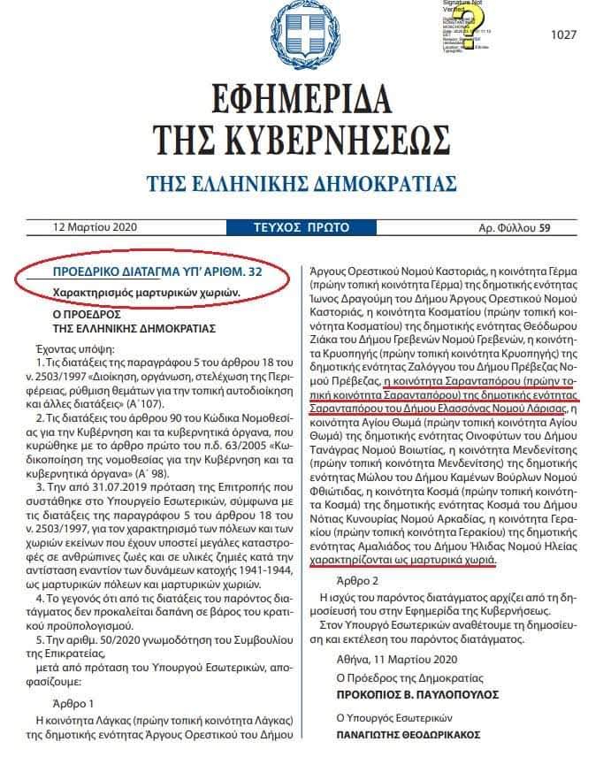 «Το 2015 ο Σύλλογος Απανταχού Σαρανταποριτών ανέλαβε πρωτοβουλία ώστε το Σαραντάπορο να ανακηρυχθεί Μαρτυρική Κοινότητα με Προεδρικό Διάταγμα. Συγκέντρωσε υλικό και μαρτυρίες των γεγονότων αυτών και το 2018 υπέβαλε ολοκληρωμένη πρόταση στο Συμβούλιο της Κοινότητας Σαρανταπόρου, όπως προβλέπει ο νόμος. Στη συνέχεια αυτή η πρόταση υποβλήθηκε στο Δημοτικό Συμβούλιο Ελασσόνας, το οποίο έλαβε παμψηφεί απόφαση για το δίκαιο αυτό αίτημα, το οποίο αφορά όλους τους κατοίκους του χωριού. Η απόφαση του Δημοτικού Συμβουλίου προωθήθηκε στην αρμόδια τριμελή επιτροπή του υπουργείου Εσωτερικών, ώστε να εξεταστεί το ορθόν της πρότασης και η επιτροπή γνωμοδότησε θετικά. Με το υπ αριθ. 32/11-3-2020 Προεδρικό Διάταγμα, το οποίο δημοσιεύθηκε στο πρώτο τεύχος της Εφημερίδας της Κυβέρνησης με αριθμό φύλλου 59/12-3-2020, το Σαραντάπορο χαρακτηρίζεται ως Μαρτυρικό Χωριό.