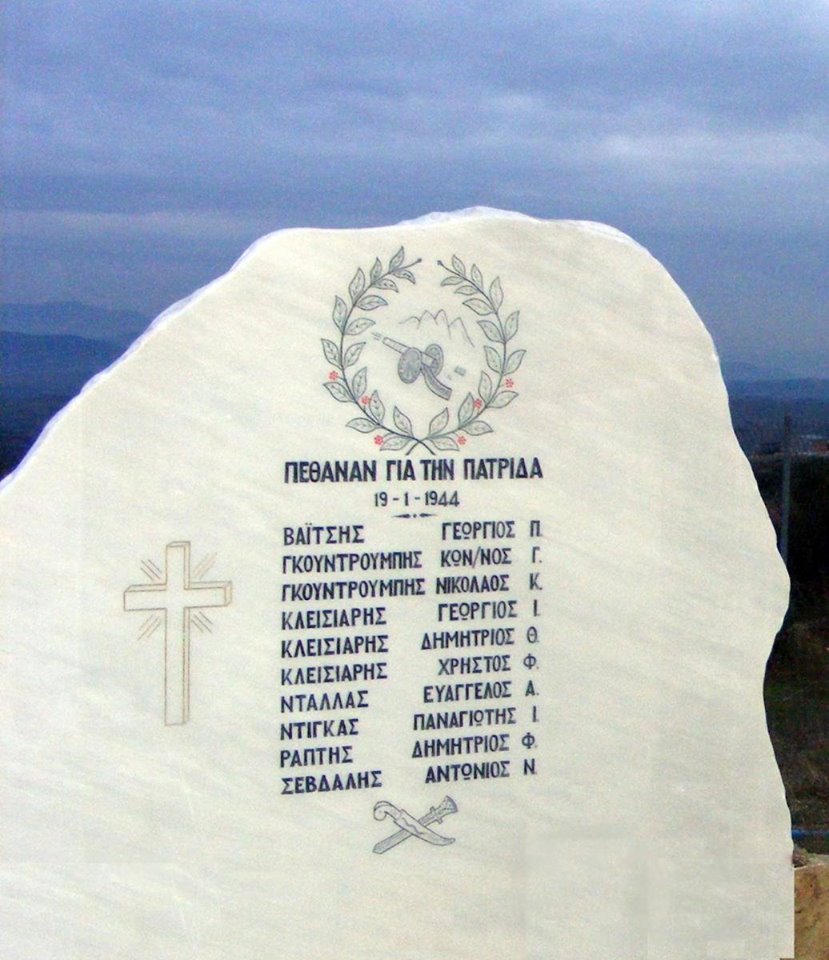 1944: Από αφηγήσεις των μεγαλυτέρων μου και της μητέρας μου σκοτώθηκε ο πατέρας μου Νικόλαος τη 19.01.1944. Θυμάμαι απλώς μια μάζα ανθρώπων στο Μέγα. Με είχε κάποιος στην αγκαλιά του αλλά ποιος ήταν δε γνώριζα. Από αφηγήσεις, ήταν ο πατέρας μου. Αργότερα που γνώρισα την κοινωνία έμαθα πως την ημέρα αυτή οι γερμανοί μαζέψανε όλα τα γυναικόπαιδα και πήραν τους άντρες αυτούς που δεν κρατούσαν δελτίο ταυτότητας γερμανικό, όσοι είχαν τους άφησαν λεύτερους. Αυτούς που δεν είχαν τους χωρίσαν από τους άλλους, γύρω στον αριθμό τριάντα άτομα και τα οδηγήσανε σε άλλο μέρος, μακριά από το χώρο που τους είχαν συγκεντρωμένους. Τους πήγαν προς τη κατεύθυνση της Κοζάνης με την προϋπόθεση να τους ανακρίνουν στο γερμανικό τμήμα Κοζάνης. Αλλά η τύχη τους ήταν αυτή γιατί σε λίγο τους βάλαν στη γραμμή, στη θέση Μελίσσι, όνομα τοποθεσίας και τότε και σήμερα. Από κει περνούσε ο δρόμος για να βγούνε στα στενά Σαρανταπόρου να πάρουν τα αυτοκίνητα για την Κοζάνη.
