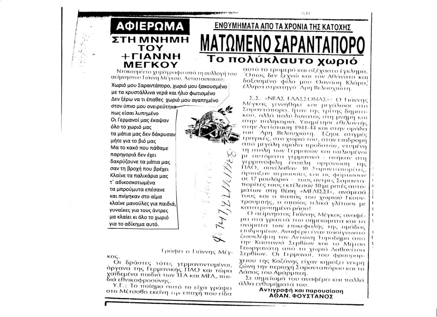 Σε μια δημοσίευση στην εφημερίδα «Νέα Ελασσόνα», στο φύλλο 141 στις 22/10/1988 με τίτλο «Ματωμένο Σαραντάπορο – το πολύκλαυτο χωριό», ο αντιστασιακός Γιάννης Μέγγος γράφει: «επιδρομή από μεγάλη ομάδα προδοτών, ντυμένοι τη στολή των Γερμανών, συνέλαβαν τριάντα Σαρανταπορίτες, άρπαξαν περιουσίες και τις φόρτωσαν σε δεκαεπτά μουλάρια. Τους άντρες, δέκα, τους εκτέλεσαν με ριπές αυτομάτων στη θέση Μελίσσι». Οι περισσότεροι από την ομάδα των προδοτών που μπήκαν στο χωριό, παρέμειναν με τους συγκεντρωμένους κατοίκους οι οποίοι, όπως αναφέρει ο Γιάννης Μέγγος στο ίδιο σημείωμα, αναγνωρίζουν στα πρόσωπα των δοσίλογων δύο άτομα. Τον Αντώνη Τυροδήμο, γνωστό ζωοκλέφτη από την Καστανιά Σερβίων και τον Μήτσο Γεωργανάκη από τη Λαβανίτσα Σερβίων.