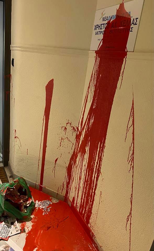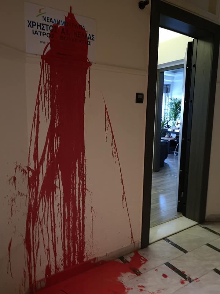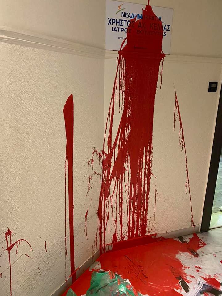 Επίθεση με μπογιές στο πολιτικό γραφείο του βουλευτή της Νέας Δημοκρατίας Χρήστου Κέλλα πραγματοποιήθηκε σήμερα στη Λάρισα.