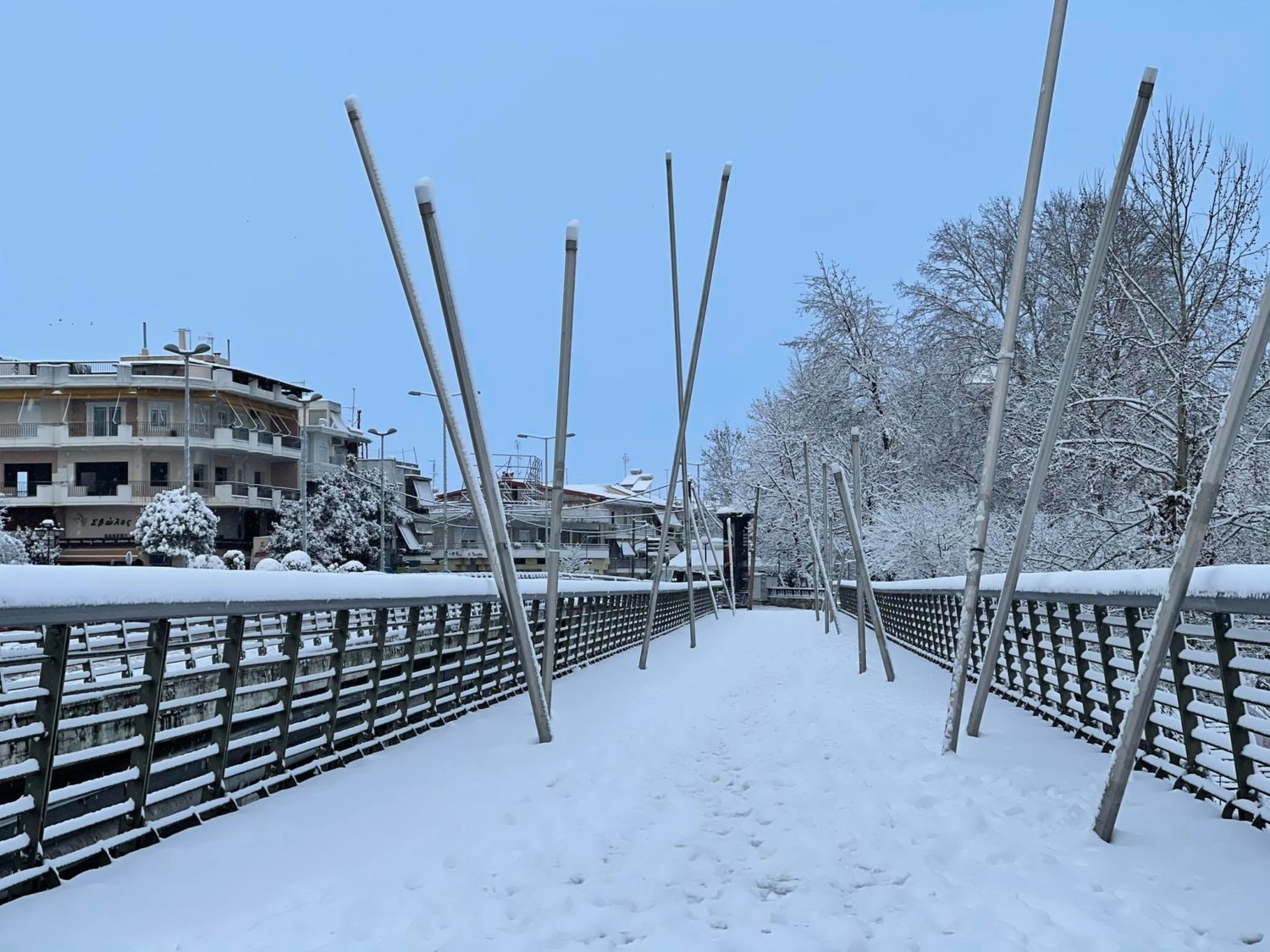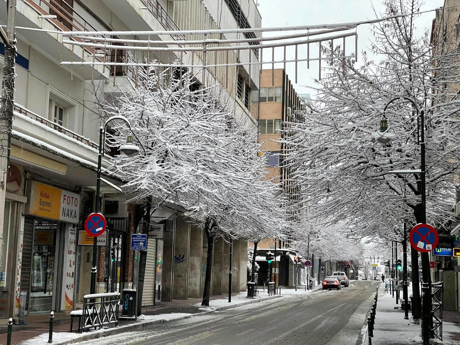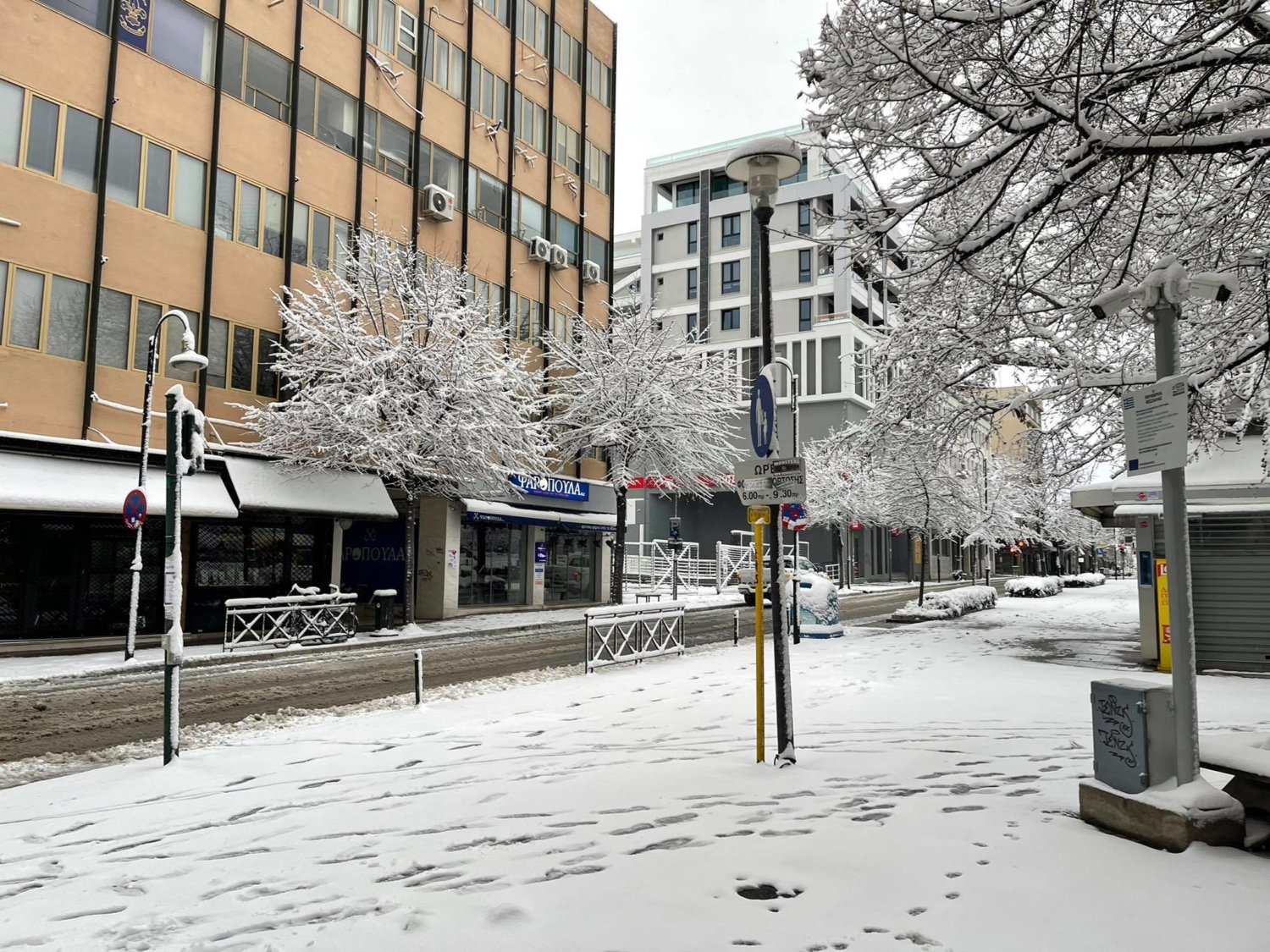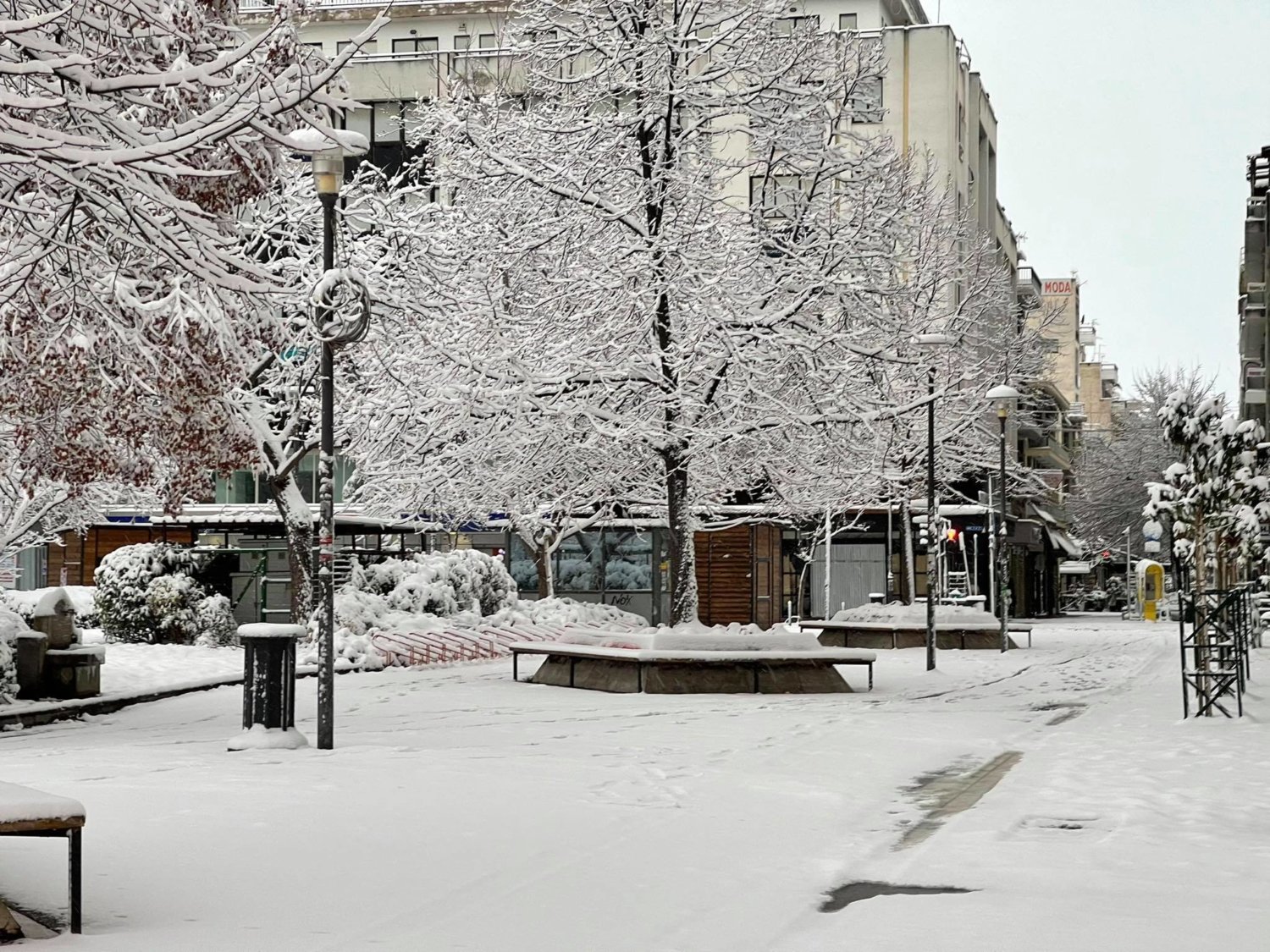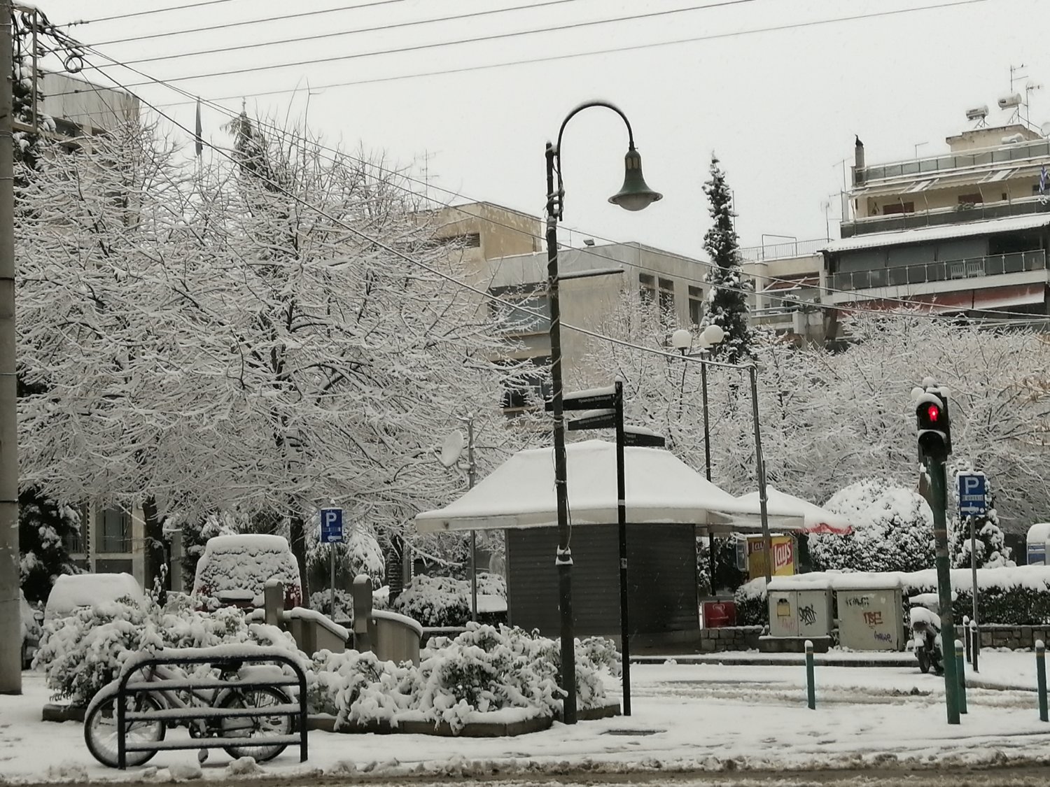 Στα λευκά ντύθηκε η πόλη της Λάρισας. Οι λίγοι συμπολίτες που κινούνται στους δρόμους αυτή την ώρα απολαμβάνουν ωραίες εικόνες.