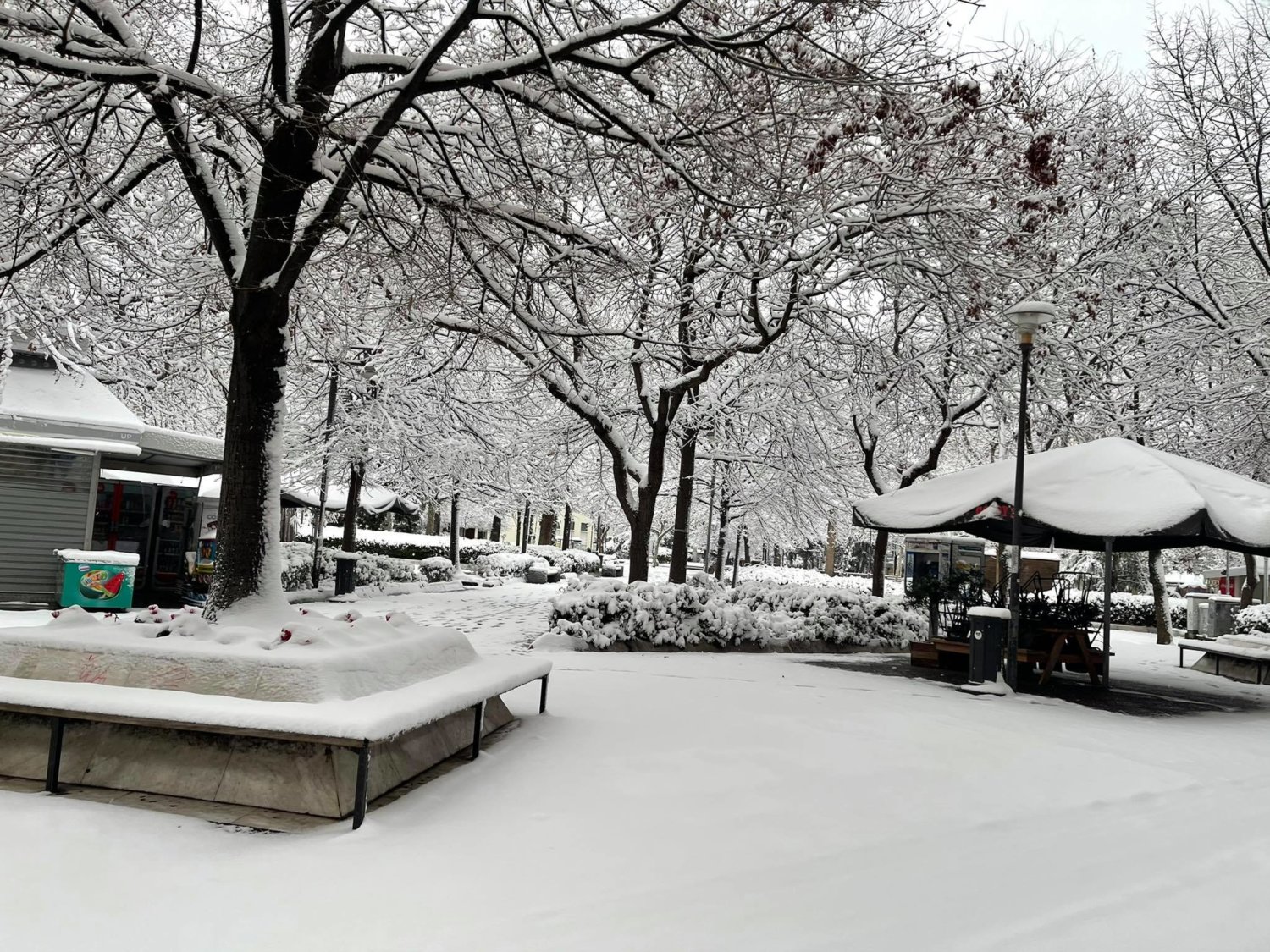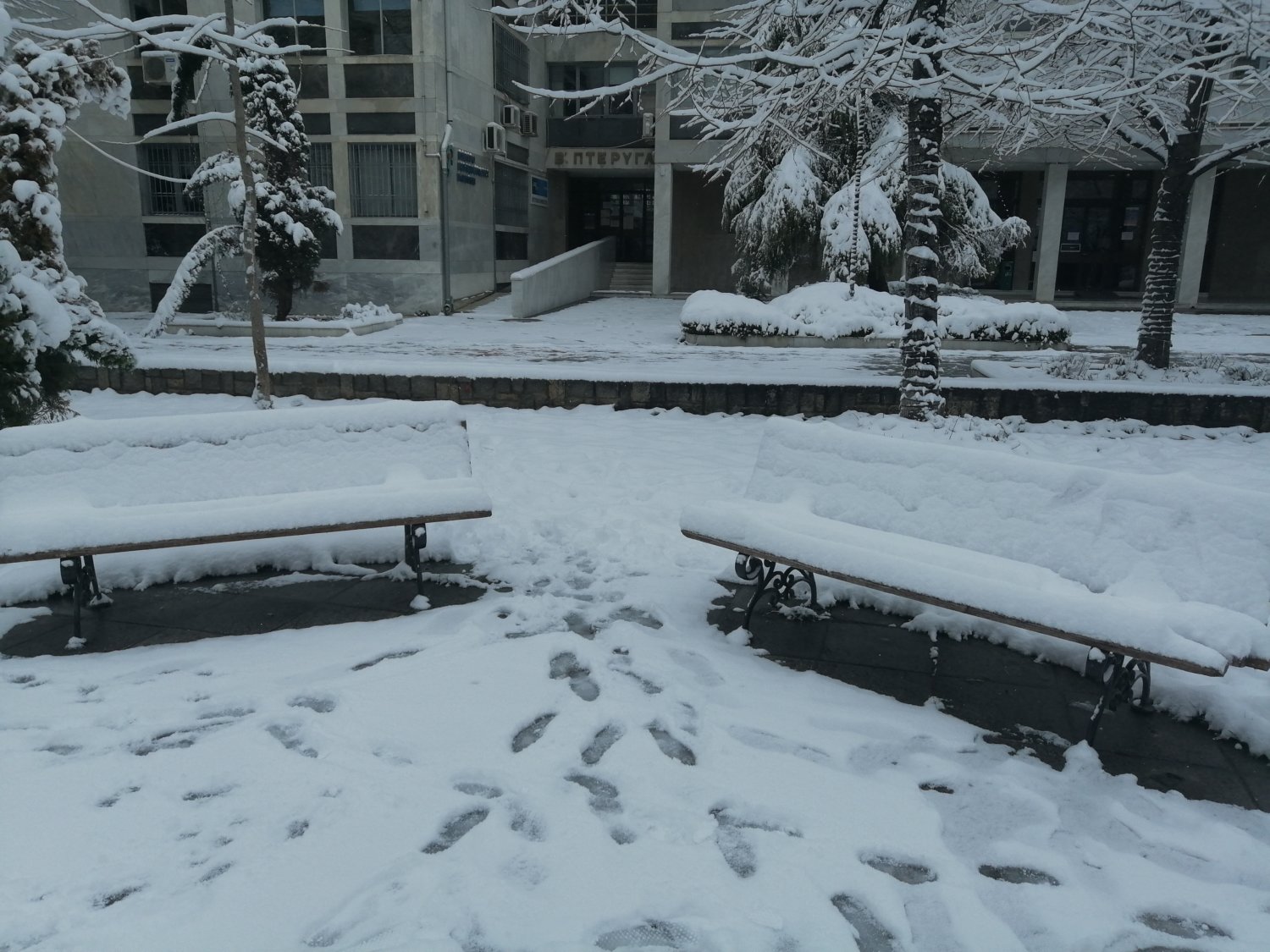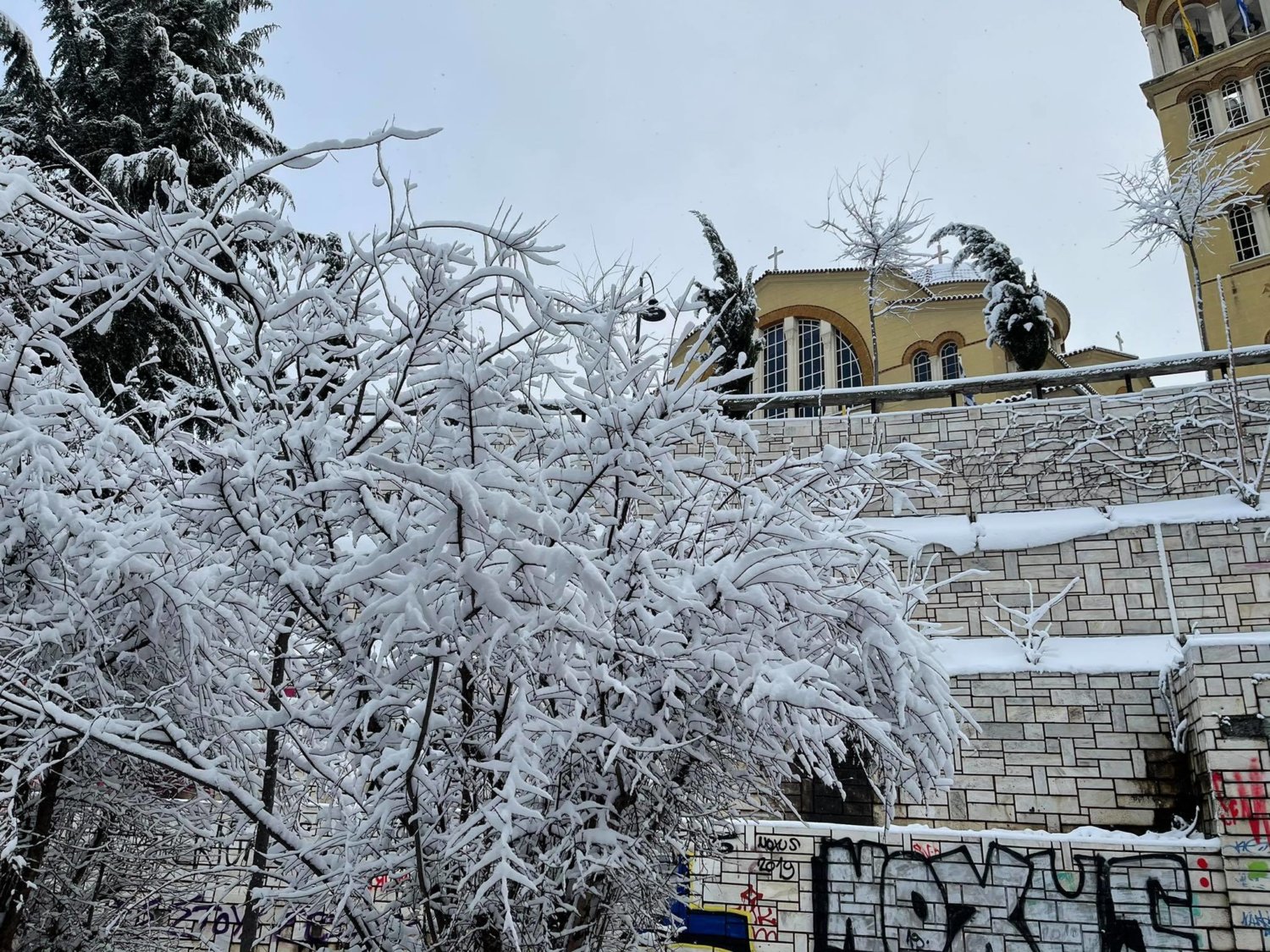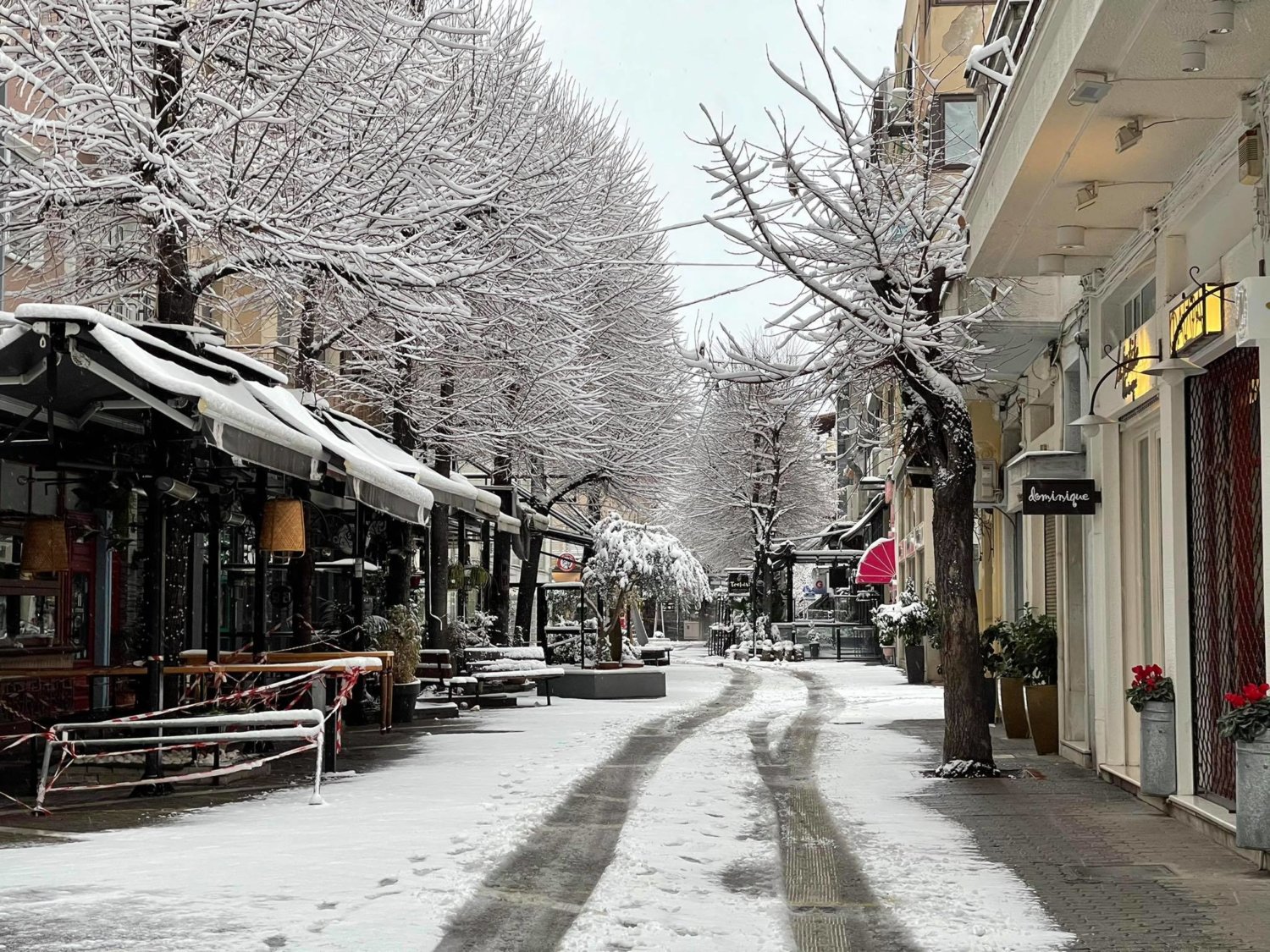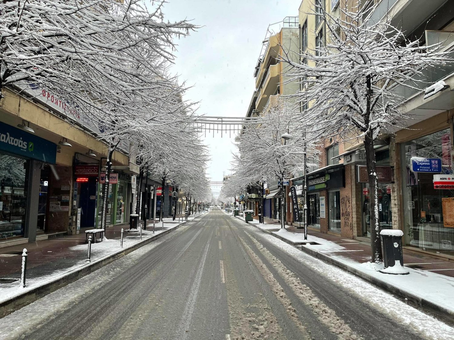 Στα λευκά ντύθηκε η πόλη της Λάρισας. Οι λίγοι συμπολίτες που κινούνται στους δρόμους αυτή την ώρα απολαμβάνουν ωραίες εικόνες.