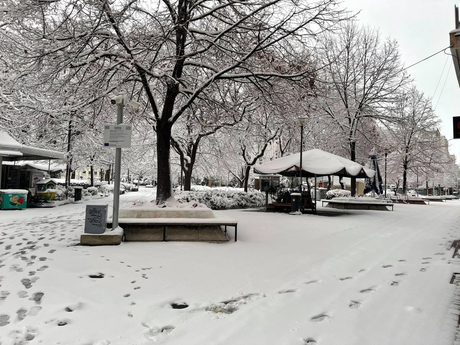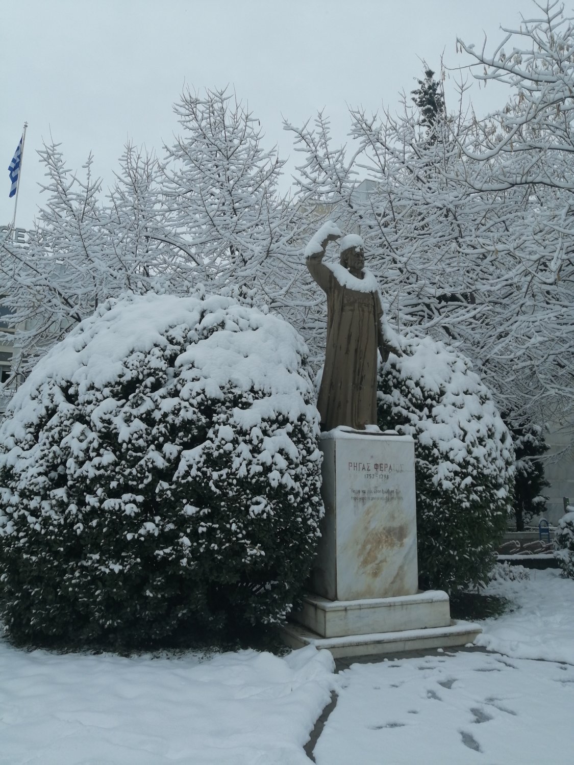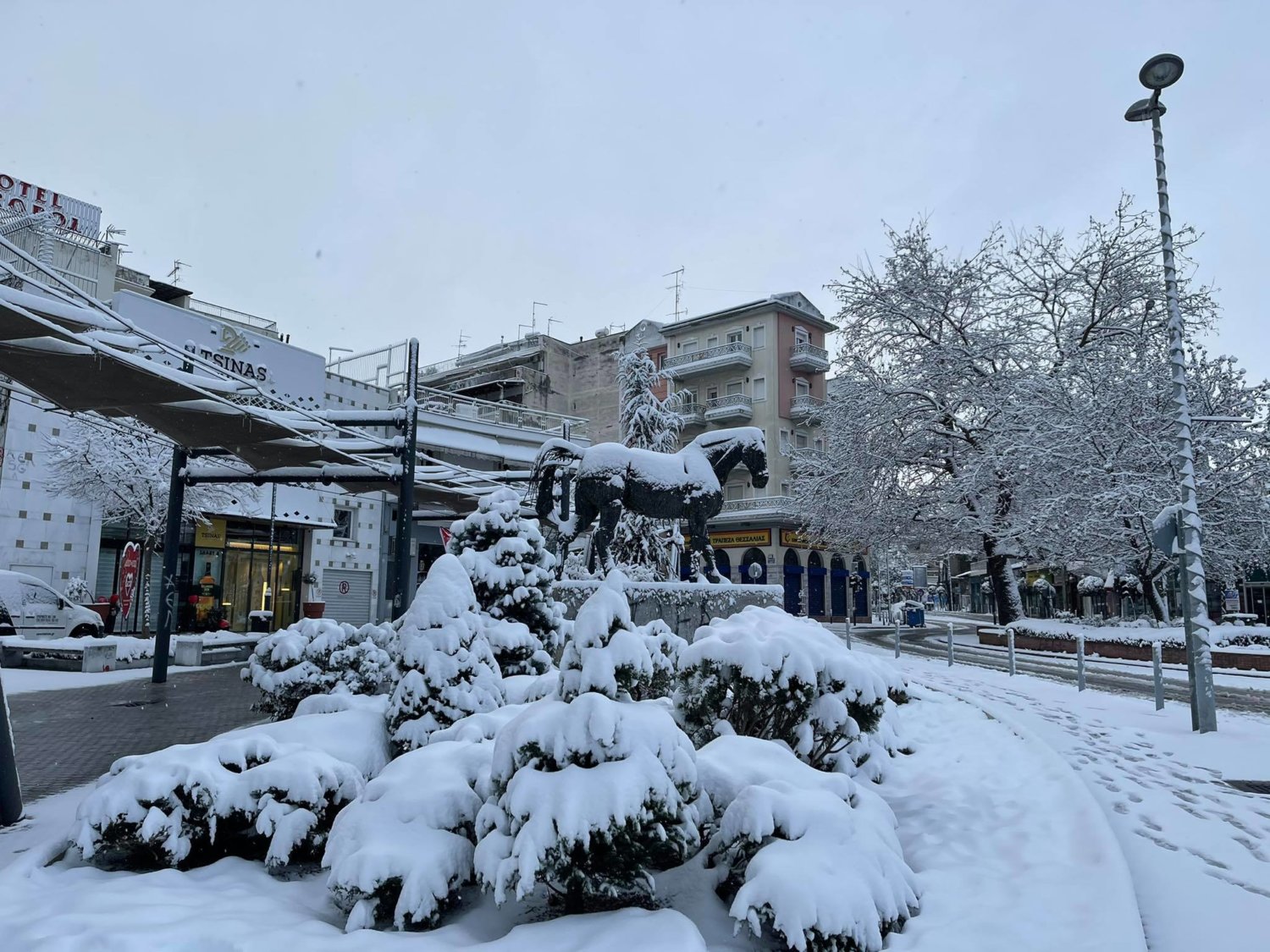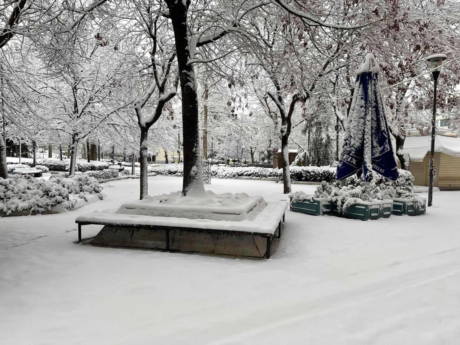 Το χιονισμένο τοπίο στην πλατεία Νομαρχίας (μπροστά από την περιφέρεια Θεσσαλίας)