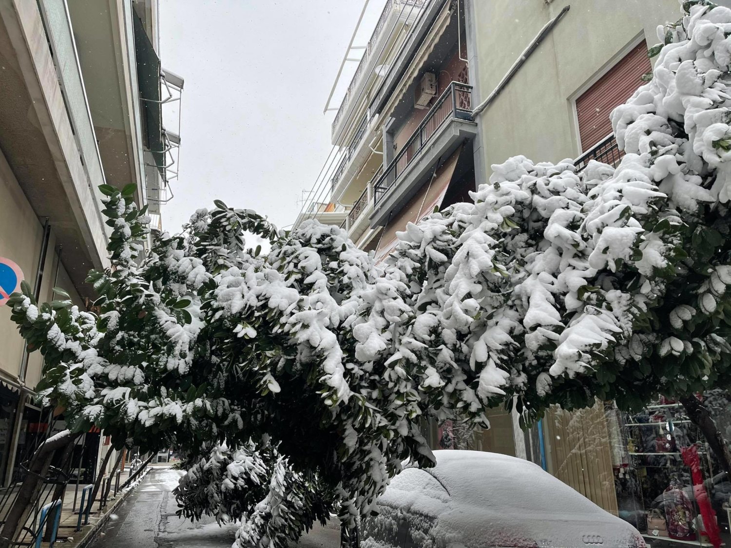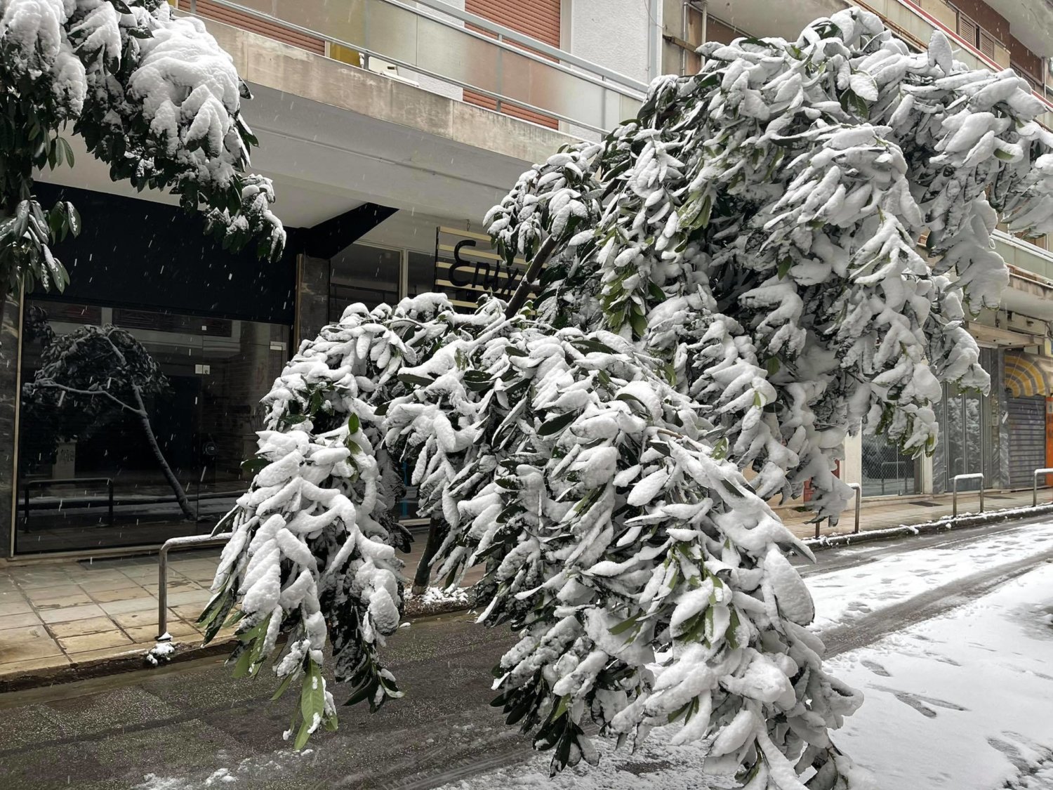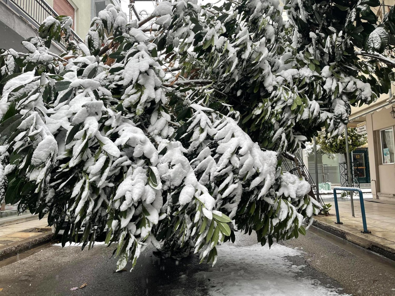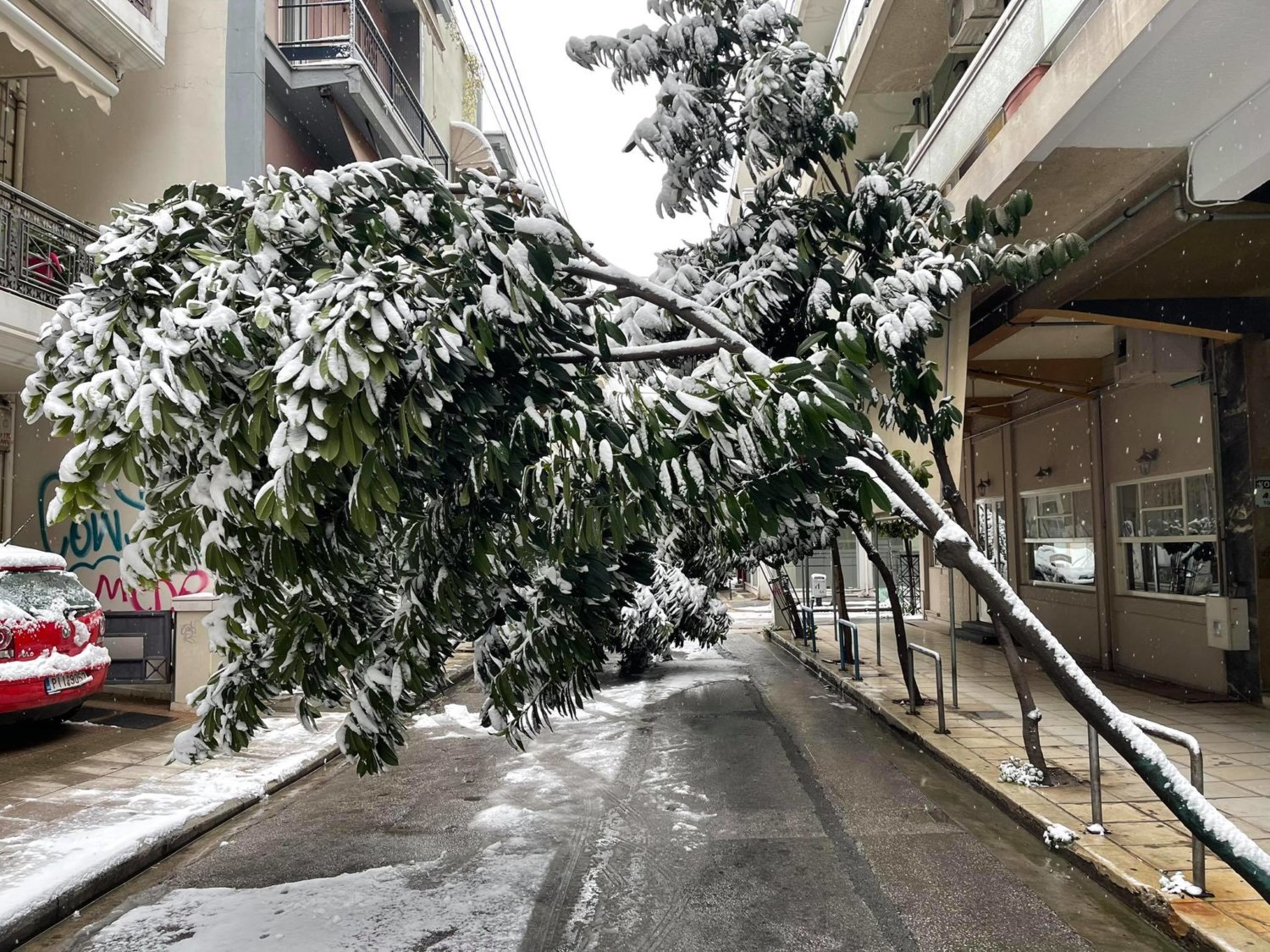 Η χιονόπτωση λύγισε αρκετά δέντρα που δεν άντεξαν στο βάρος του λευκού πέπλου στο κέντρο της Λάρισας. Χαρακτηριστικές είναι οι εικόνες από τη Διογένους.