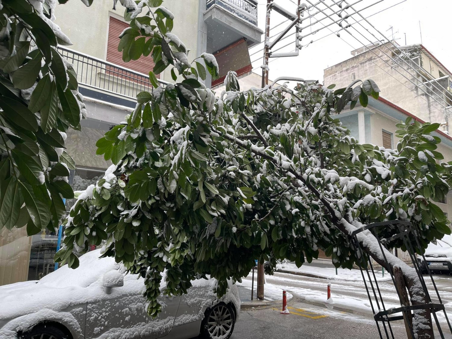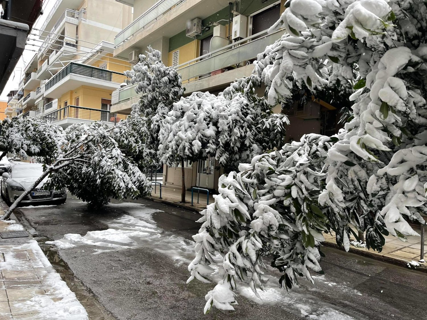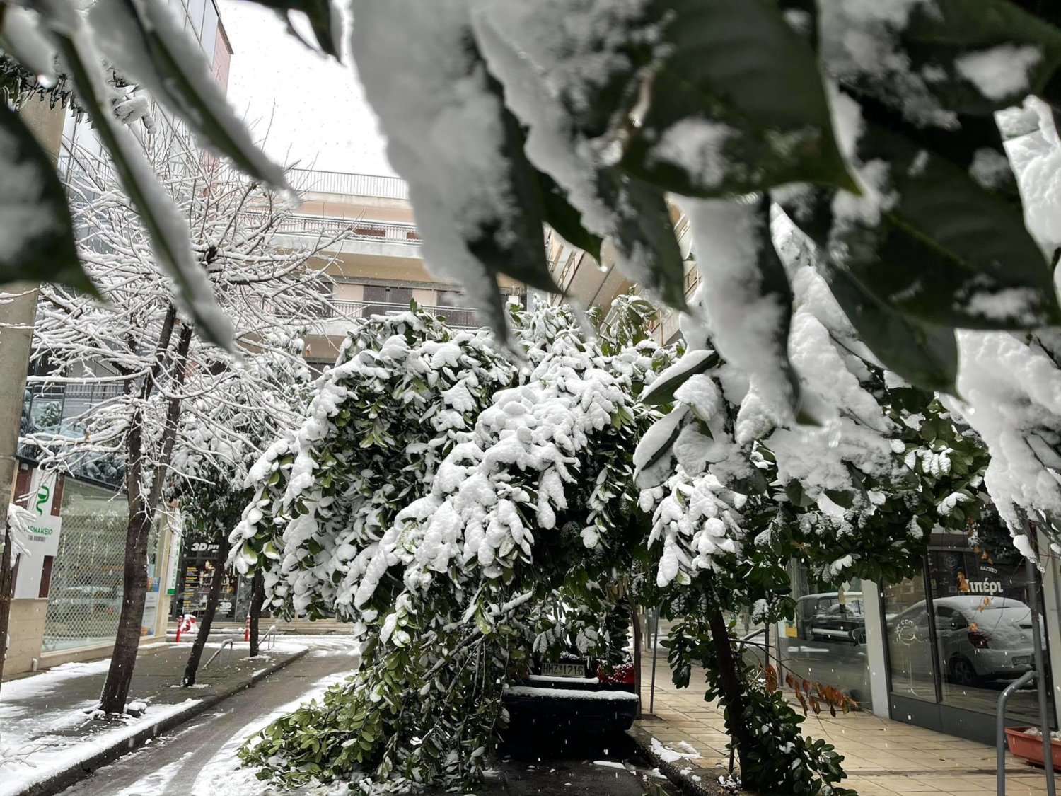 Η χιονόπτωση λύγισε αρκετά δέντρα που δεν άντεξαν στο βάρος του λευκού πέπλου στο κέντρο της Λάρισας. Χαρακτηριστικές είναι οι εικόνες από τη Διογένους.
