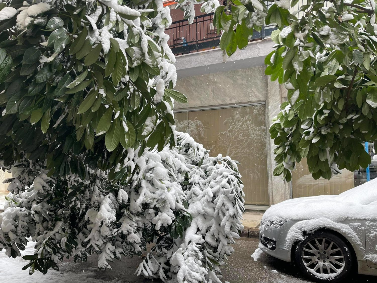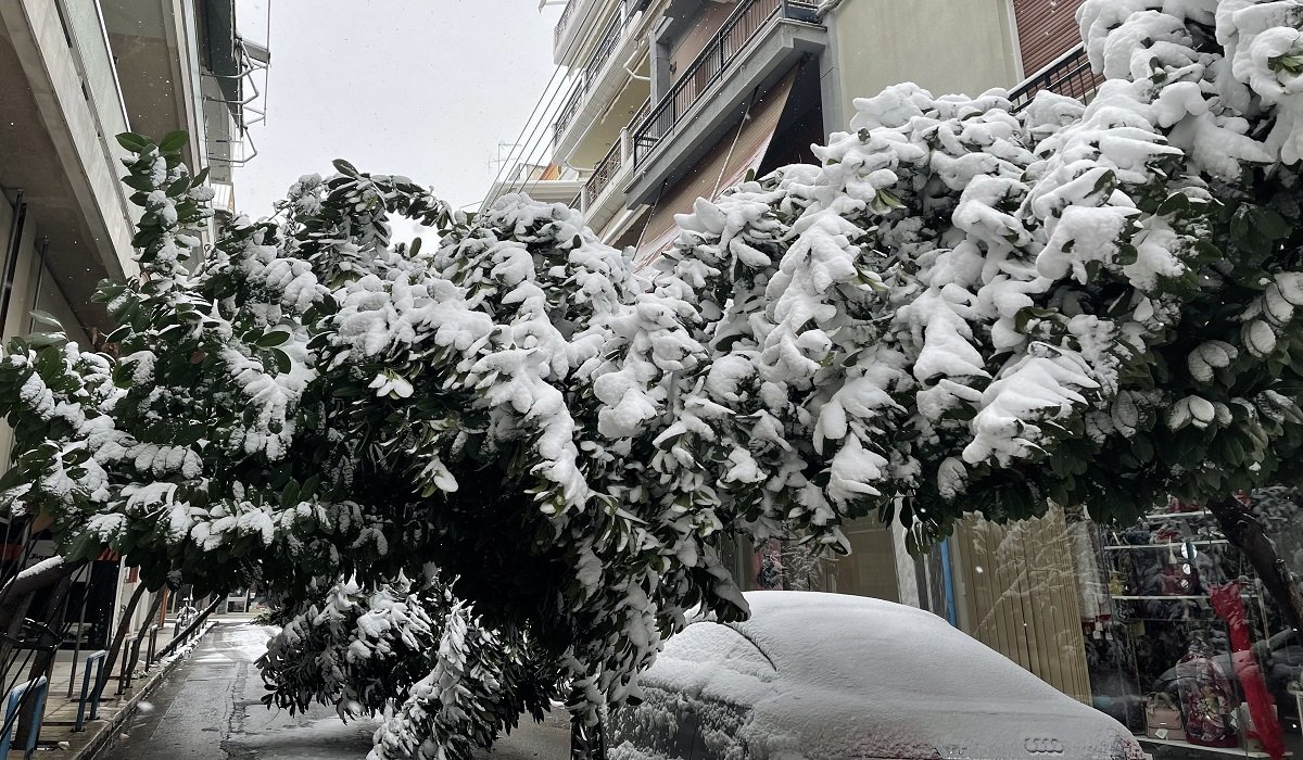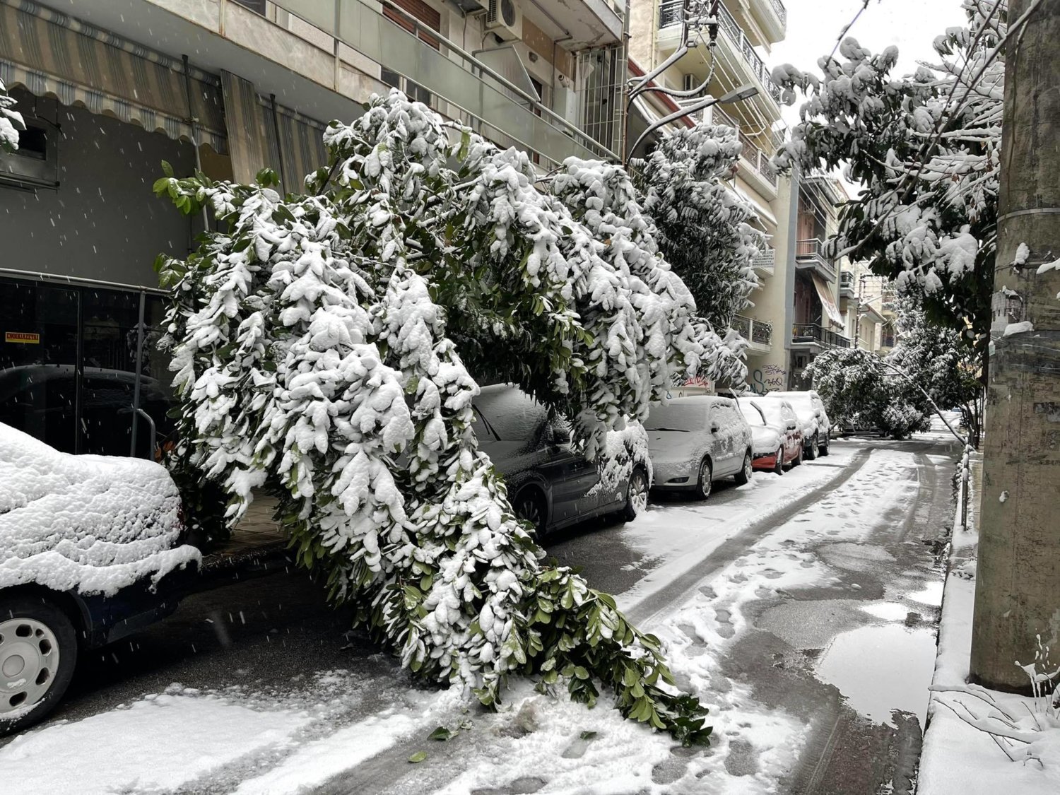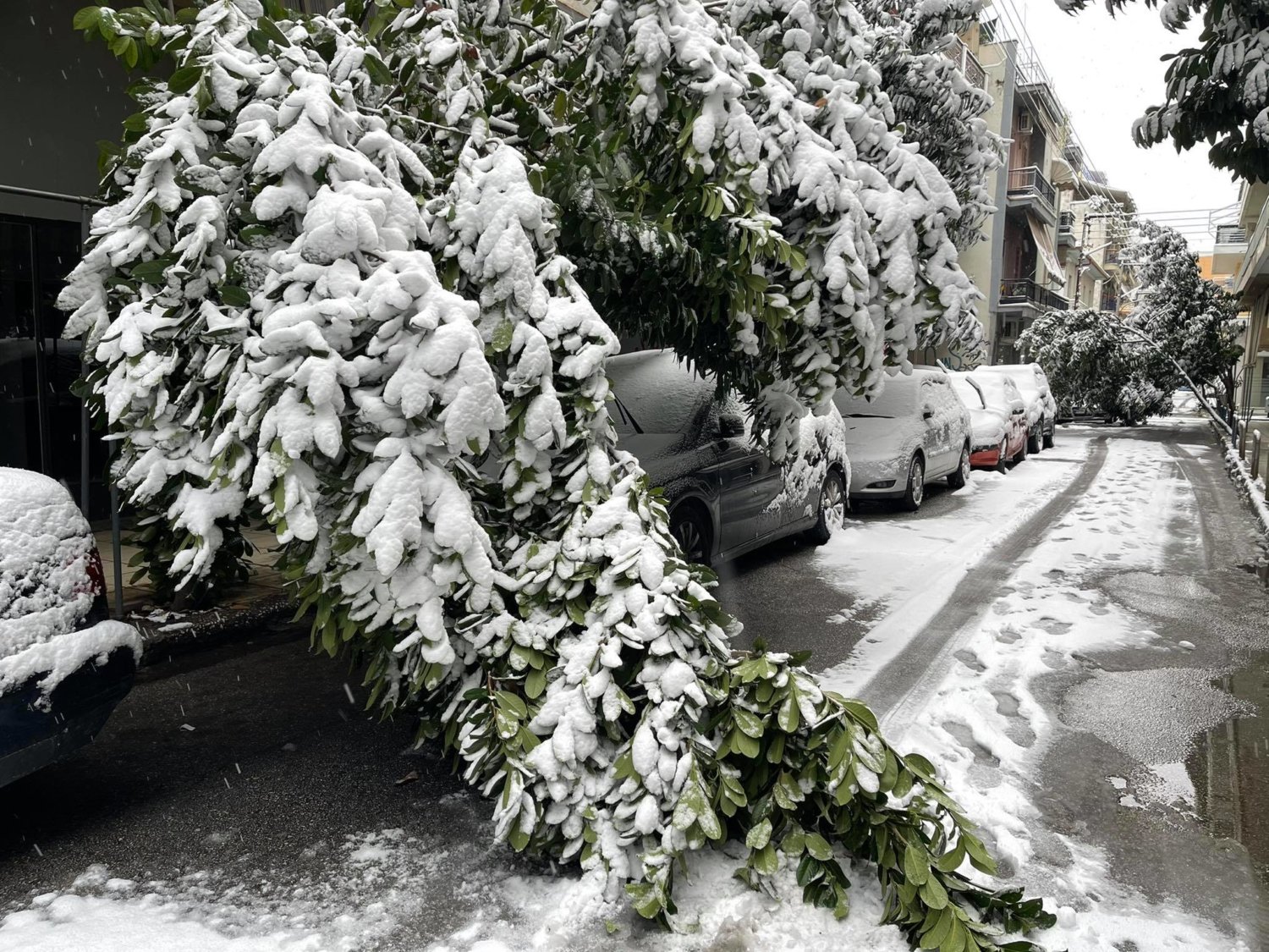 Η χιονόπτωση λύγισε αρκετά δέντρα που δεν άντεξαν στο βάρος του λευκού πέπλου στο κέντρο της Λάρισας. Χαρακτηριστικές είναι οι εικόνες από τη Διογένους.