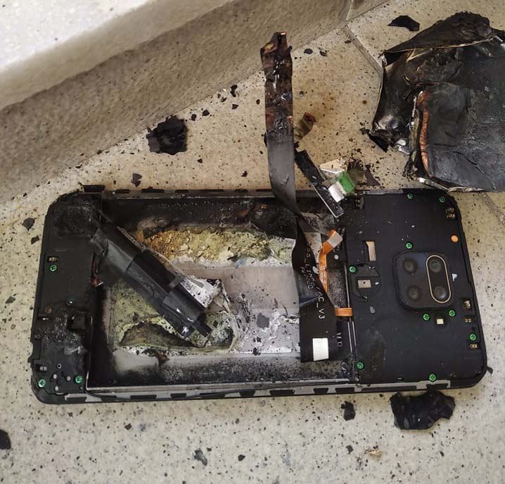 Άρχισε να θερμαίνεται και να διογκώνεται και μέσα σε δευτερόλεπτα να βγάζει καπνούς και σπίθες, απ’ τις οποίες μάλιστα κάηκε και ένα κομμάτι από το στρώμα του κρεβατιού. Άφησε το τηλέφωνο από τα χέρια και αυτό έπεσε κάτω αφήνοντας σημάδι στο πάτωμα, όπως φαίνεται στην παρακάτω φωτογραφία.