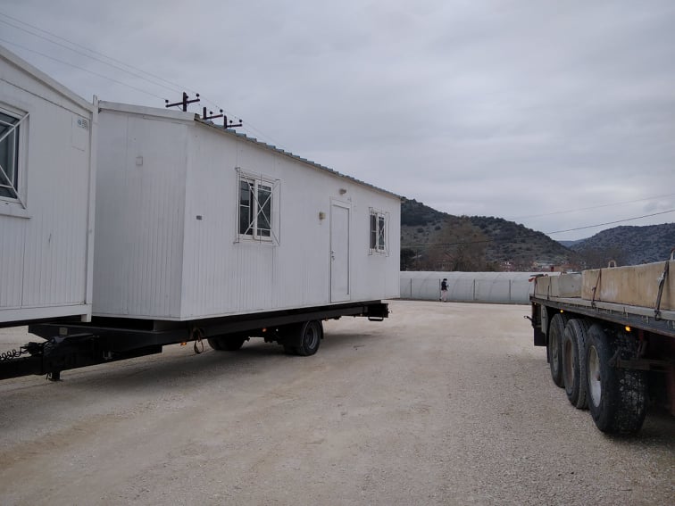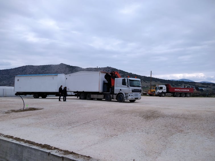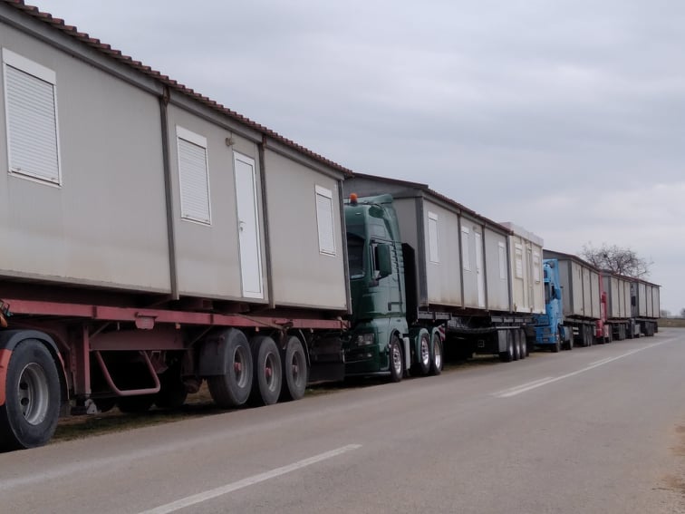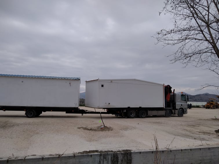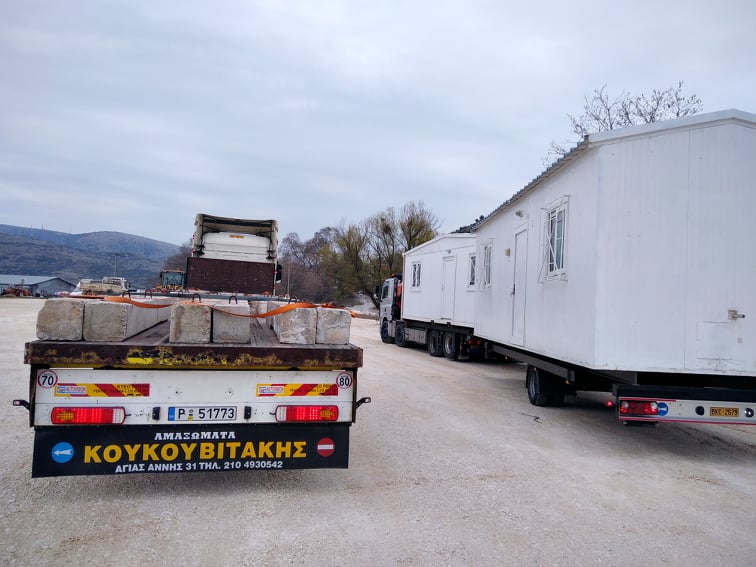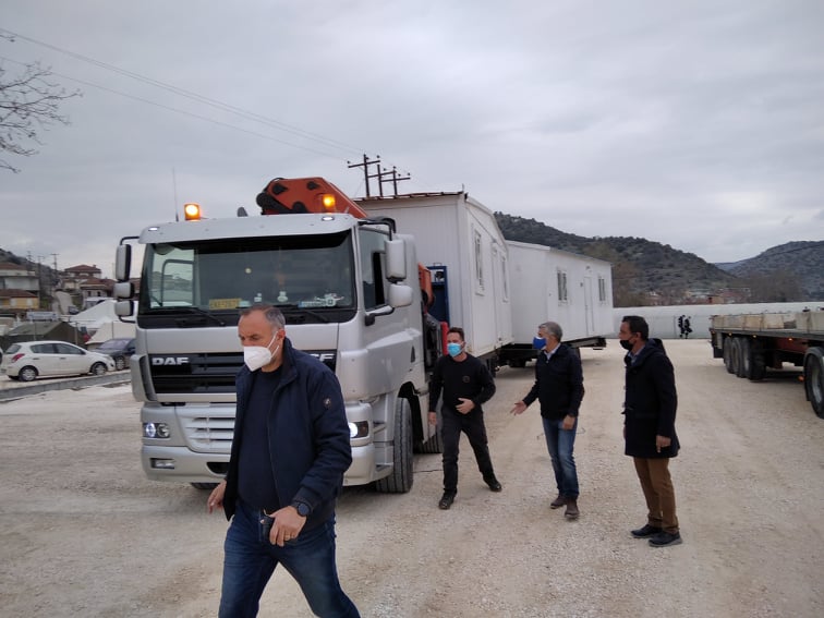 Οι πρώτοι οικίσκοι που θα στεγάσουν οικογένειες σεισμόπληκτων, έφτασαν στο Δαμάσι το μεσημέρι της Τρίτης, 9 Μαρτίου 2021.