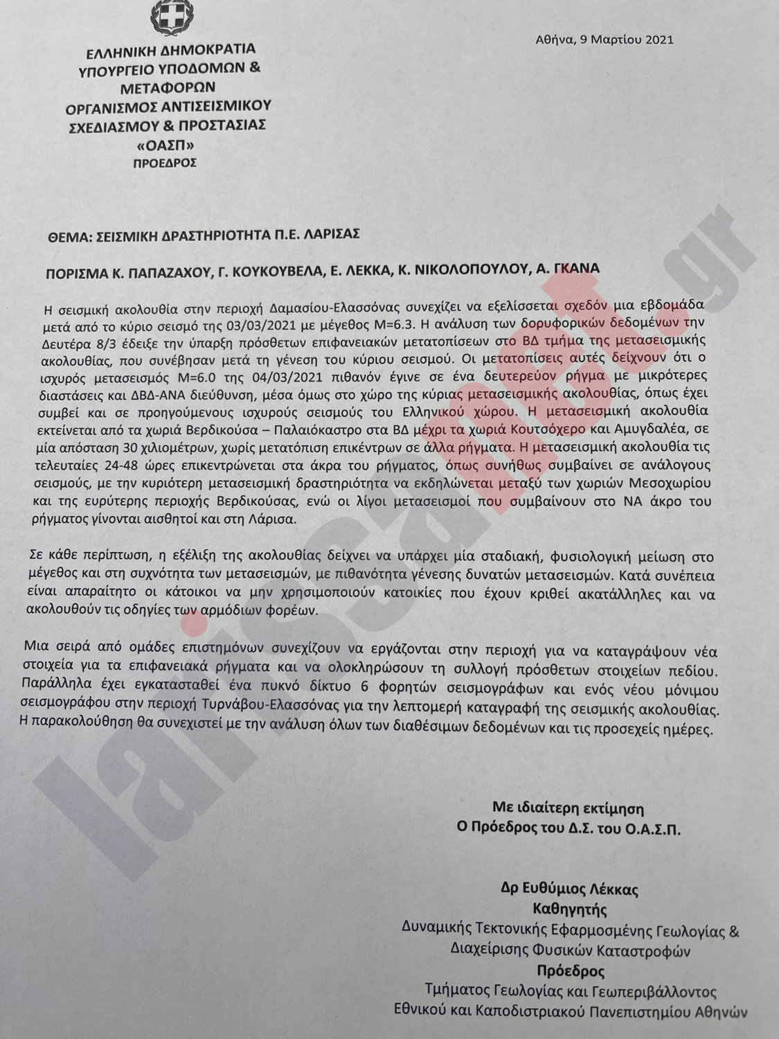 Μεταξύ άλλων κρίσιμο είναι το συμπέρασμα ότι ο μετασεισμός 6 Ρίχτερ, της Πέμπτης 4 Μαρτίου «πιθανόν έγινε σε ένα δευτερεύον ρήγμα… μέσα στον χώρο της κύριας μετασεισμικής ακολουθίας…».