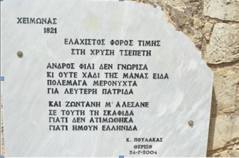 Εκεί, δίπλα σε μια αιωνόβια ελιά με καταρρακωμένο σώμα απ’ την οδύνη χρόνων, είδα μια μυλόπετρα και μια άσπρη πλακέτα. Πλησίασα αμέριμνη και ρίγησα σύγκορμη με όσα διάβασα: Η μυλόπετρα αυτή σε χρήση στο ελαιοτριβείο Θερίσου, χρησιμοποιήθηκε από τον Τούρκο κατακτητή το χειμώνα του 1821 για να σκοτώσει αλέθοντας την αγωνίστρια Χρυσή Τσεπέτη, γεμάτη νιάτα και ομορφιά.