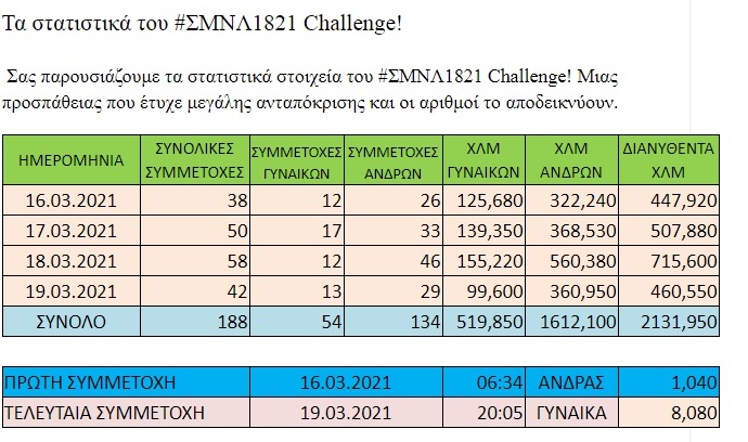 Τελικά ήταν λίγα τα χιλιόμετρα όμως η προσπάθεια δεν τελειώνει εδώ. «Μπορούν να τρέχουν όλοι μέχρι την 25 η Μαρτίου όπως είχαμε βάλει στόχο αρχικά και να δούμε πόσα χιλιόμετρα θα καταγραφούν συνολικά» προσθέτει και εξηγεί πως μπορούν να βάζουν τα ανάλογα Hashtag #ΣΜΝΛ #1821 #ΣΜΝΛ1821