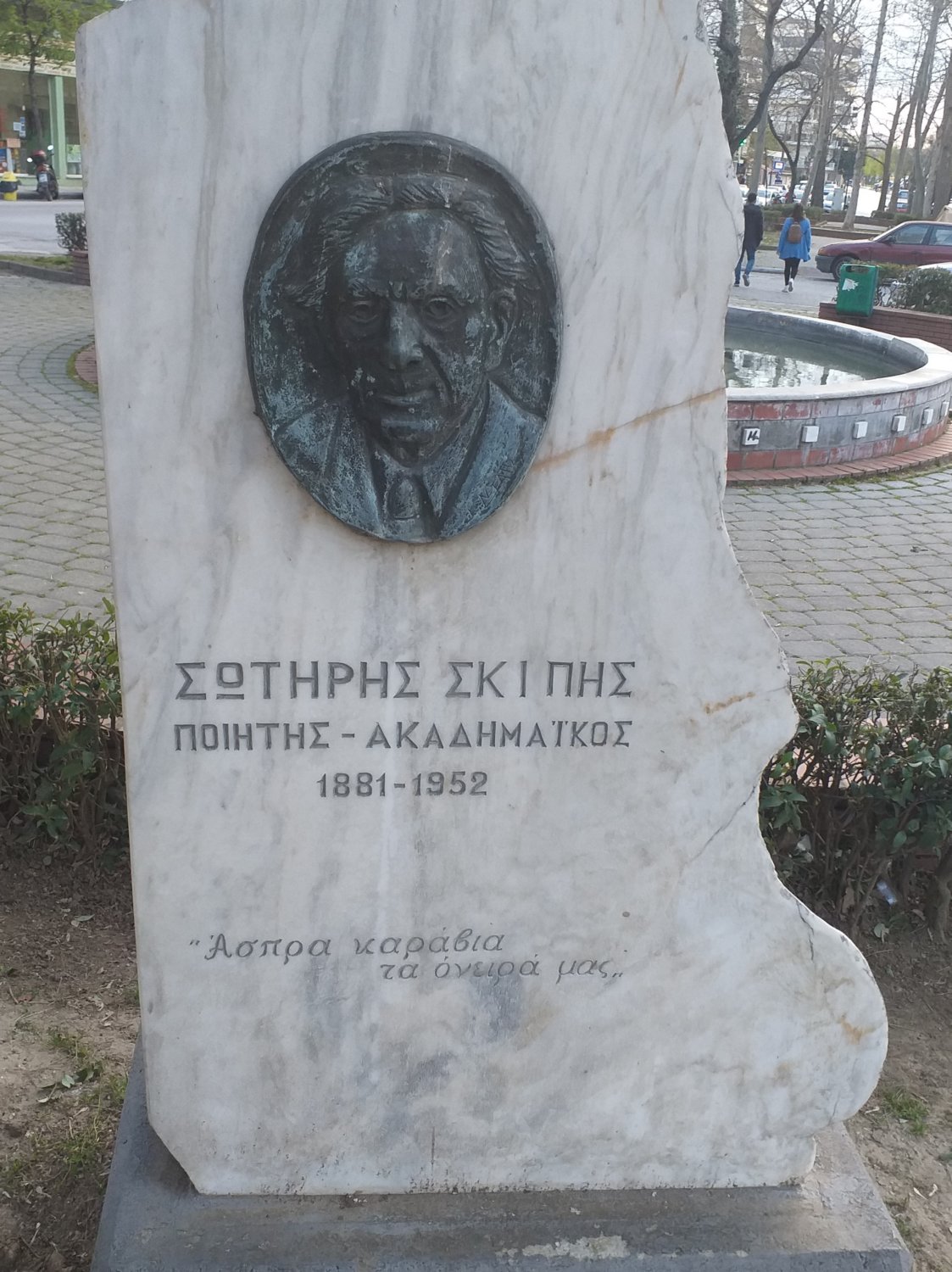 Η στήλη βρίσκεται στην πλατεία Σωτήρη Σκίπη στην περιοχή Σάλια. Ο λυρικός ποιητής και ακαδημαϊκός Σωτήρης Σκίπης (Αθήνα 1881-Ρονιάκ Γαλλίας 1952) γεννήθηκε στην Αθήνα αλλά πέρασε τα παιδικά του χρόνια έως την ηλικία των 14 ετών στη Λάρισα. Ο πατέρας του ήταν Ταγματάρχης. Το 1897 πήγε στην Αθήνα για σπουδές στη Δραματική Σχολή του Βασιλικού. Σπούδασε επίσης Αισθητική και Λογοτεχνία στο Παρίσι. Το 1922 τιμήθηκε με το Εθνικό Αριστείο Γραμμάτων και το 1924 διορίστηκε διευθυντής της Ανωτάτης Σχολής Καλών Τεχνών. Το 1938 ο Όμιλος Διανοουμένων Λαρίσης οργάνωσε γιορτή για να τον τιμήσει, στην οποία ο ποιητής παρευρέθη. Το 1946 εκλέχθηκε μέλος της Ακαδημίας Αθηνών στην έδρα Γραμμάτων και Τεχνών. Τιμήθηκε με το παράσημο της Λεγεώνας της τιμής από το Γαλλικό Κράτος και με το βραβείο της Γαλλικής Ακαδημίας. Συνεργαζόταν με εφημερίδες και περιοδικά για λογοτεχνικά θέματα. Εκτός από ποιήματα έγραψε πεζά, θεατρικά, μελέτες, ενώ ασχολήθηκε και με τη μετάφραση. Ο Κώστας Νταής φιλοτέχνησε το έργο το 2007, το οποίο στήθηκε στον χώρο της πλατείας με δαπάνη της ΕΛΟΣΥΛ και φροντίδα του Δ.Σ. Αποτελείται από μαρμάρινη στήλη ακανόνιστου σχήματος, που εδράζεται σε βάθρο. Στην μπροστινή όψη υπάρχει οβάλ ορειχάλκινη, έξεργη, ανάγλυφη προτομή του Σωτήρη Σκίπη, όπου η μορφή του ποιητή αποδίδεται με εκφραστικότητα και ζωντάνια, με κυρίαρχα τα χαρακτηριστικά του προσώπου. Ο γλύπτης υπογράφει την προτομή και στη στήλη εγχάρακτα διαβάζουμε τον στίχο του ποιητή: «άσπρα καράβια τα όνειρά μας».