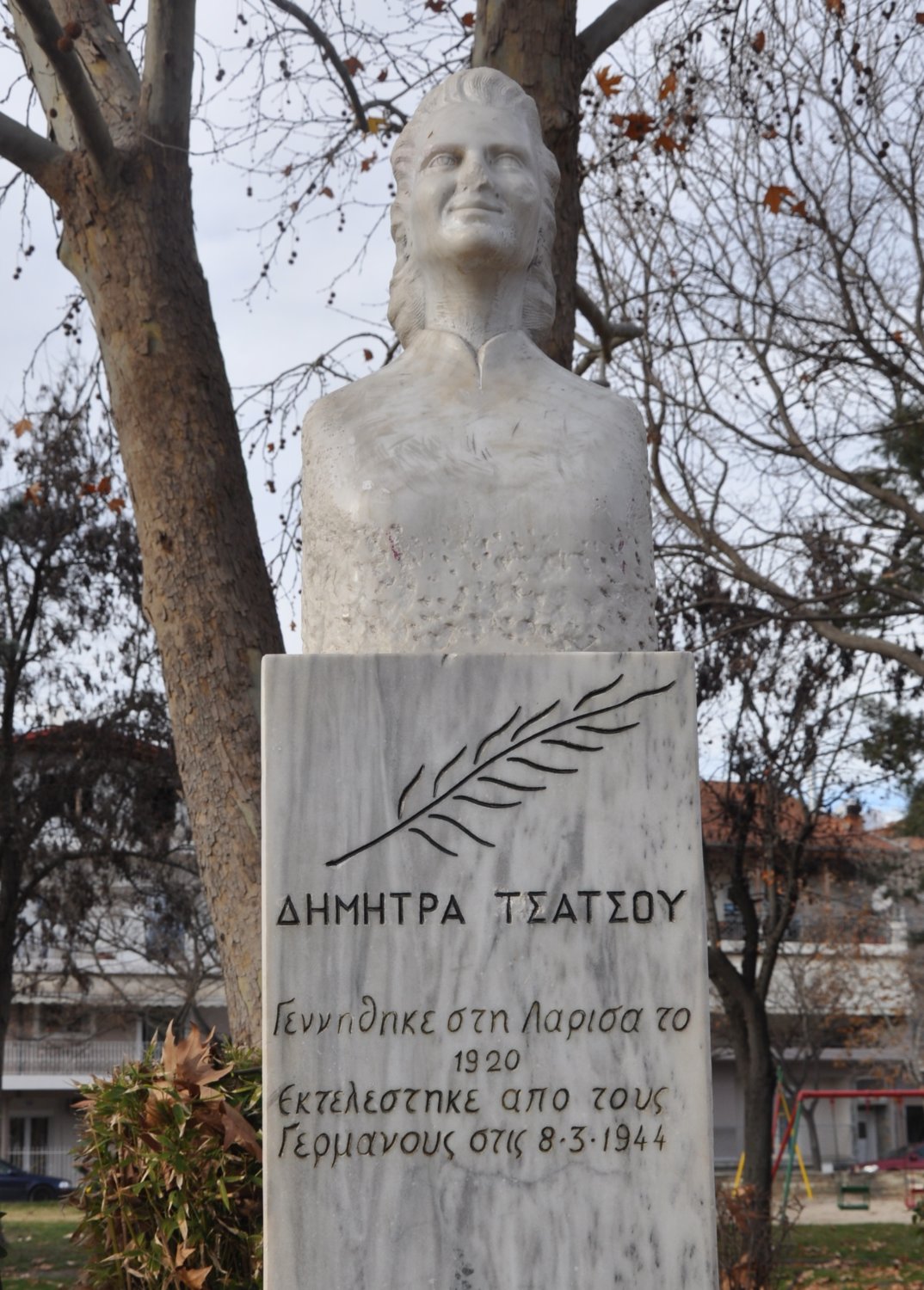 Την προτομή της Δήμητρας Τσάτσου, φιλοτεχνημένη από τον γλύπτη βρίσκουμε στην ομώνυμη πλατεία, που περικλείεται από τις οδούς Δαβάκη, Κατσίγρα, Αγγελακοπούλου και Μπαλντούμη. Η προτομή στήθηκε από τον Δήμο Λάρισας το 1991 ως ελάχιστος φόρος τιμής στη μνήμη της Δήμητρας Τσάτσου (1921-1944), Λαρισαίας ηρωίδας της αντίστασης ενάντια στους κατακτητές, η οποία οδηγήθηκε στο εκτελεστικό απόσπασμα των γερμανικών στρατευμάτων στις 8/3/1944 μαζί με άλλους 39 πατριώτες, ως αντίποινα για την ανατίναξη της γερμανικής αμαξοστοιχίας στα Τέμπη στις 23/2/1944. Το βάθρο της προτομής θυμίζει το μικρό ύψωμα της εκτέλεσης (τη μαγούλα του αντιαεροπορικού Λάρισας). Η απουσία λεπτομερειών στο ένδυμα προβάλλει περισσότερο τη μορφή με το έντονο βλέμμα και τα ζυγωματικά του προσώπου. Η κόμη αποδίδεται ελεύθερη μέχρι τους ώμους, ενδεικτική της νεαρής ηλικίας. Στο πλαϊνό μέρος της προτομής είναι η υπογραφή του γλύπτη και η χρονολογία.