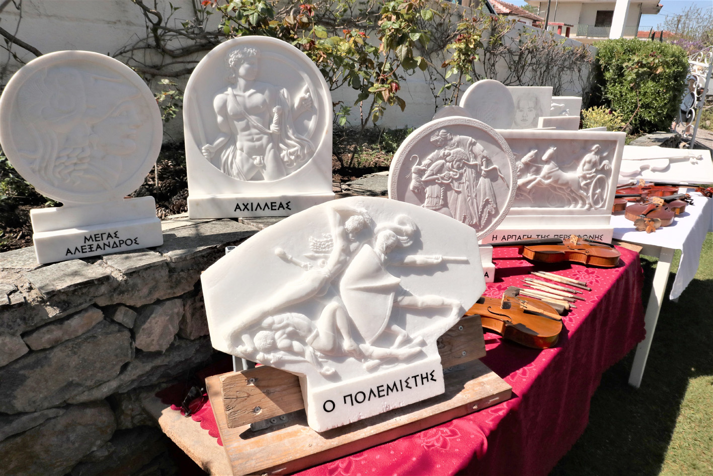 Στην μέση της αυλής του βρίσκονται μια «Αρπαγή της Περσεφόνης» όπως εκείνη αποτυπώθηκε στον τάφο της Αμφίπολης. Ο Πηλέας και η Θέτιδα που μάλωσαν για να γίνουν ζευγάρι, ένας έφηβος Αχιλλέας και ένας πολεμιστής.