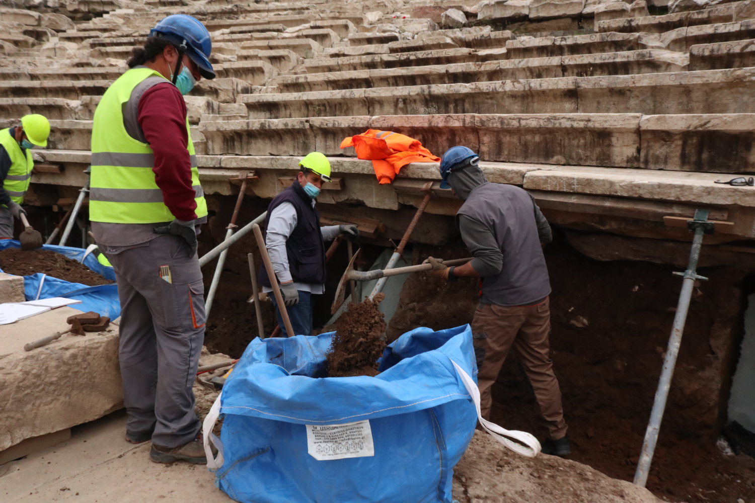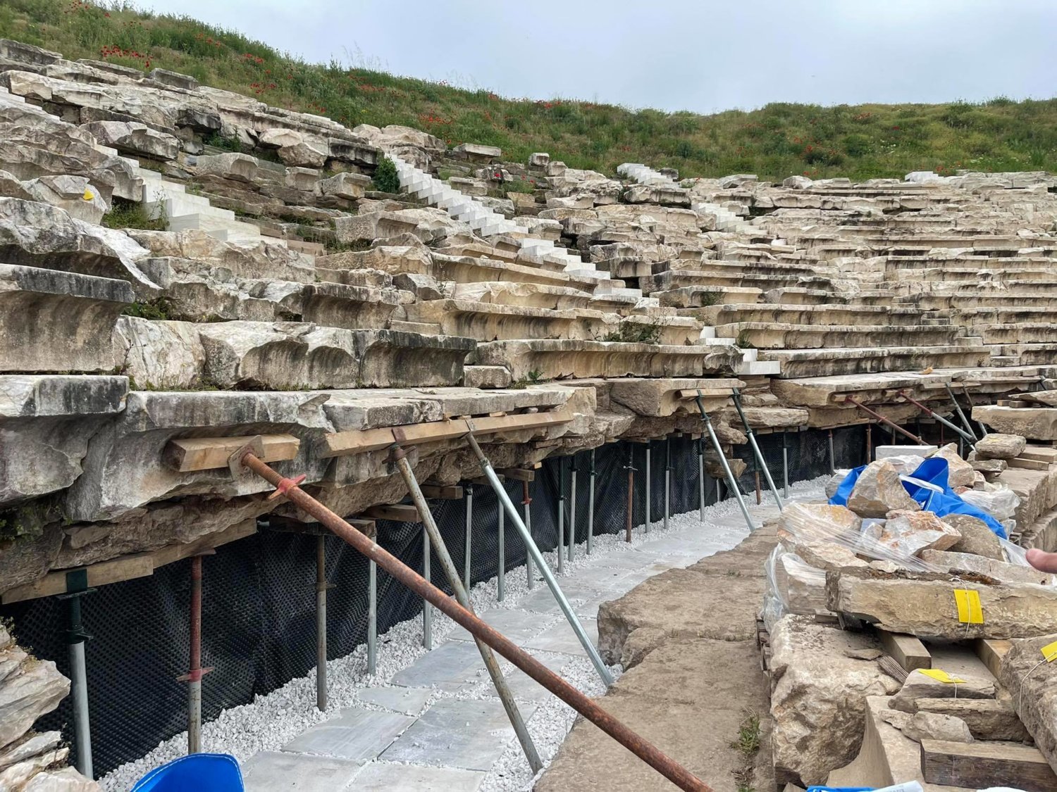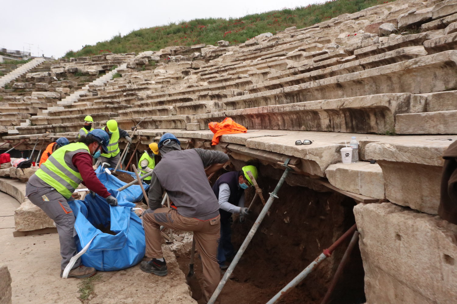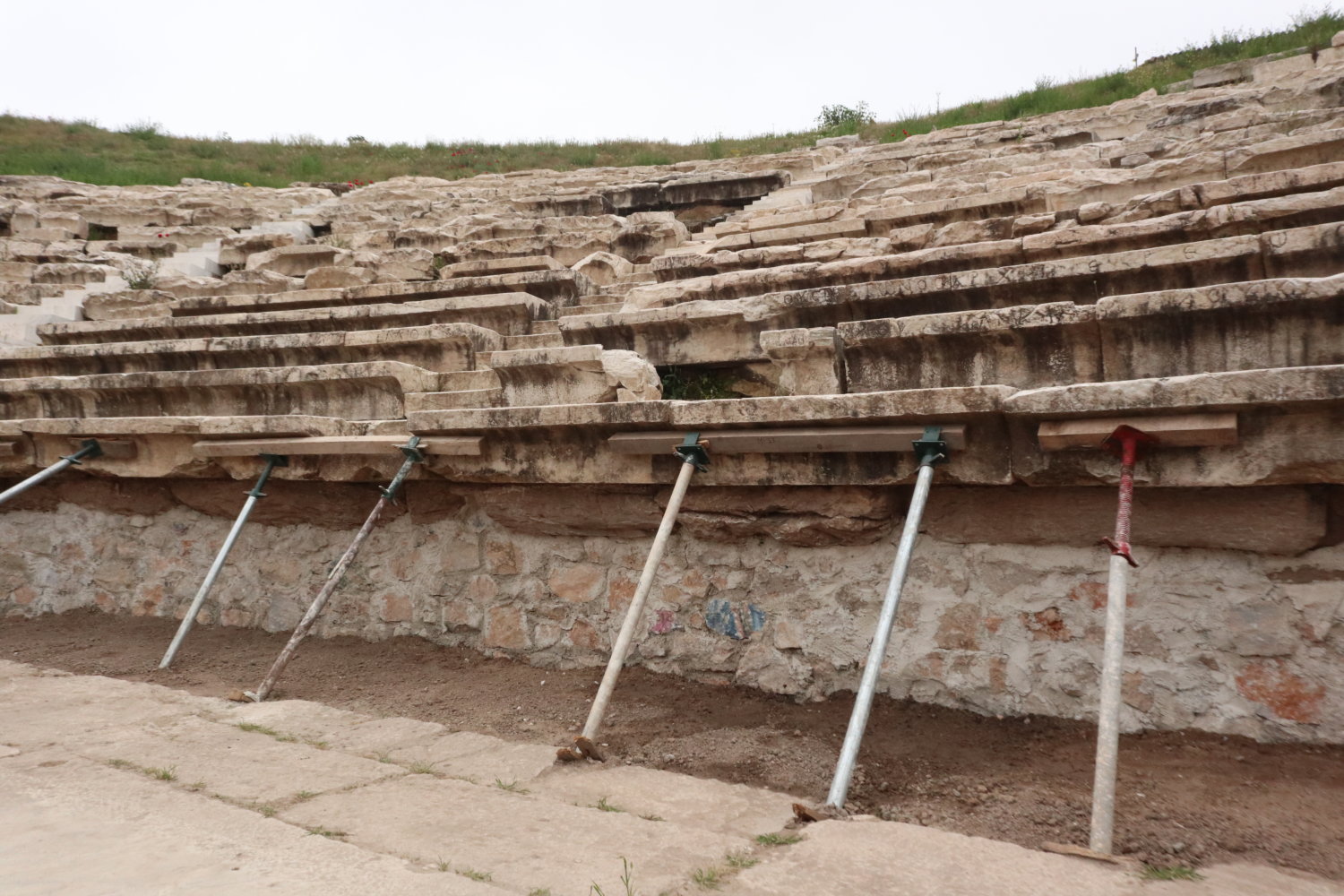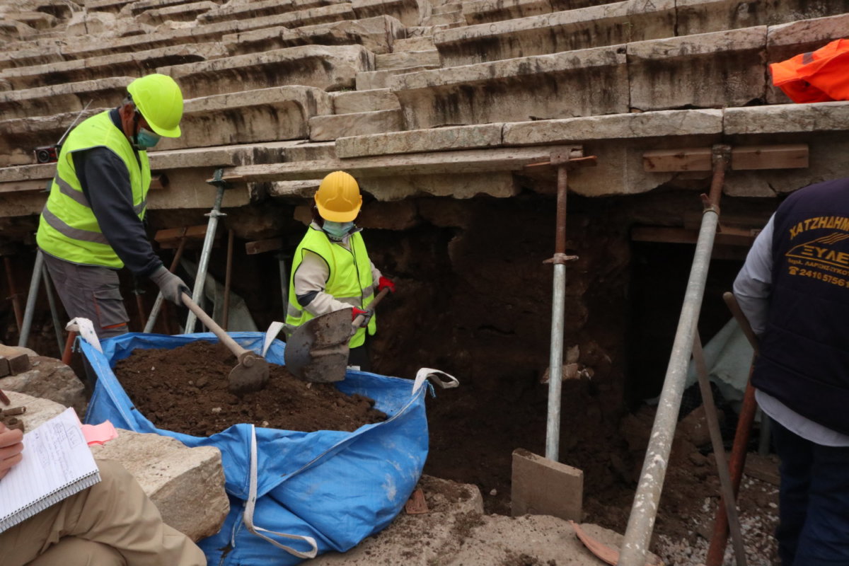 Ο Δημήτρης Καραγκούνης τονίζει ότι οι εργασίες αντιστήριξης που προβλέπονται είναι κάτι που γίνεται «πρώτη φορά σε τέτοιο μεγάλο εύρος, σε αρχαίο θέατρο, διότι το σύνολο της πρώτης σειράς είναι υποστυλωμένο σε διαδοχικές φάσεις», η πρώτη σειρά είναι «στον αέρα» όπως επισημαίνει «ώστε να δημιουργηθεί εσοχή όπου στην τελική φάση ερχόμαστε και βάζουμε λιθοδομή» καταλήγει.