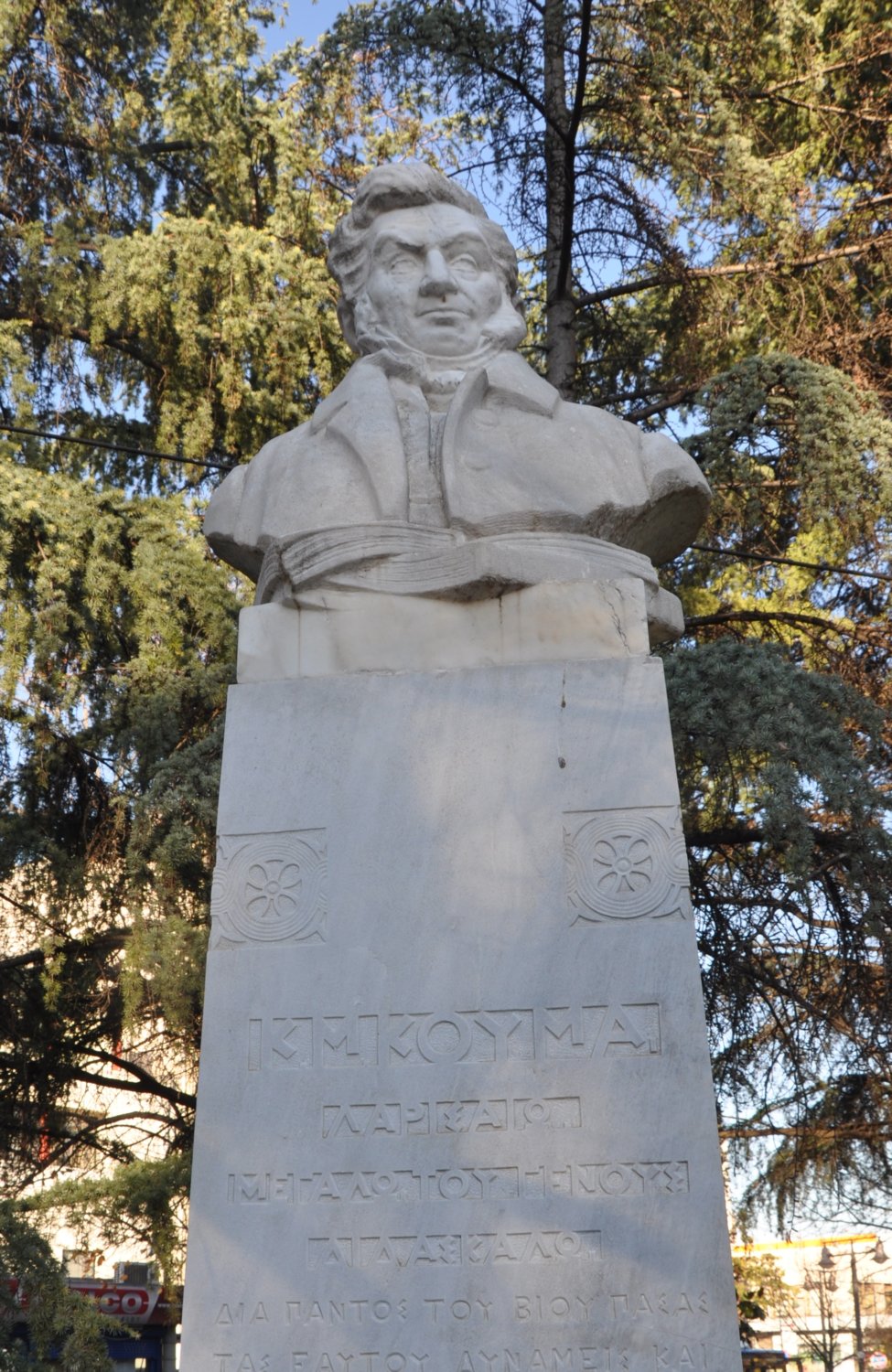 Στη βορειοδυτική γωνία της Κεντρικής Πλατείας της Λάρισας βλέπουμε την προτομή του Κωνσταντίνου Κούμα, την οποία ο γλύπτης φιλοτέχνησε σε μάρμαρο το 1930. Ο λόγιος Κωνσταντίνος Κούμας(1777-1836), διδάσκαλος του Γένους, ιστορικός, φιλόσοφος, πρωτεργάτης του νεοελληνικού διαφωτισμού με αξιόλογη πανεπιστημιακή μόρφωση και μεταφραστής λογοτεχνικών έργων, γεννήθηκε το 1777 στη Λάρισα και πέθανε το 1836 στην Τεργέστη της Ιταλίας. Το 1787 η οικογένειά του κατέφυγε στον Τύρναβο λόγω του λοιμού, όπου ο Κων/νος είχε διδάσκαλο για 6 χρόνια τον Ιωάννη Πέζαρο. Διδάχθηκε αρχαίους Έλληνες συγγραφείς, βασικές αρχές φιλοσοφίας, μαθηματικά, γεωμετρία και φυσική.