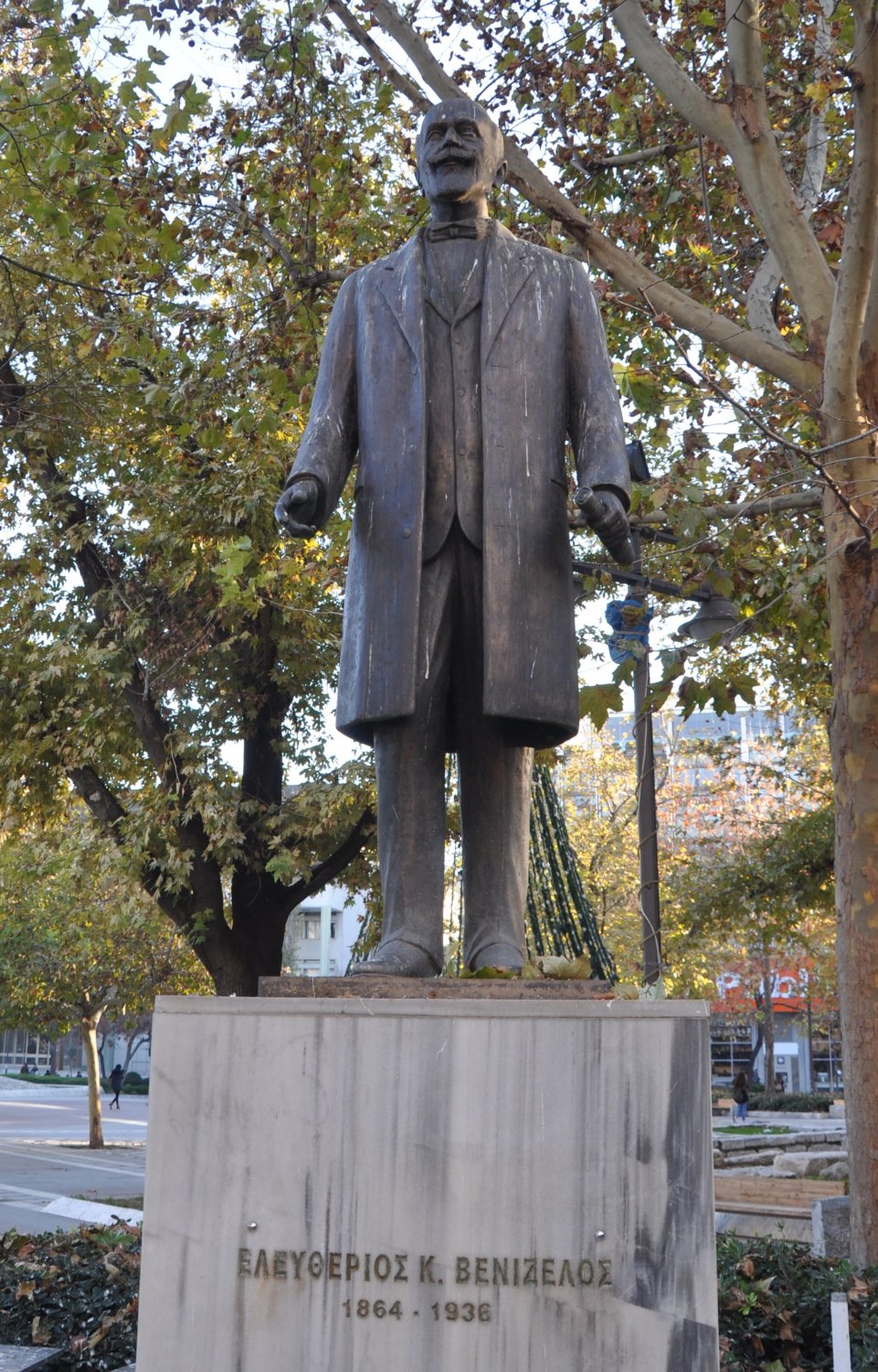 Ο ορειχάλκινος ανδριάντας του Ελευθερίου Βενιζέλου βρίσκεται στην πλευρά της Κεντρικής Πλατείας προς την οδό Κύπρου. Ο Ελευθέριος Βενιζέλος υπήρξε πολιτικός, Πρωθυπουργός της Κρητικής Πολιτείας και 7 φορές πρωθυπουργός της Ελλάδας. Επίσης δικηγόρος, δημοσιογράφος, συγγραφέας και μεταφραστής. Συνέδεσε το όνομά του με το όραμα της Μεγάλης Ελλάδας. Γεννήθηκε στις Μουρνιές Χανίων στις 11/23 Αυγούστου 1864 και πέθανε στο Παρίσι στις 18/3/1936. Σπούδασε στη Νομική Σχολή Αθηνών, άσκησε τη δικηγορία στα Χανιά αλλά σύντομα τον απορρόφησε η πολιτική. Κατά την επανάσταση του 1897 ανέδειξε τις ηγετικές και πολιτικές του ικανότητες, καθώς και τις διπλωματικές του αρετές.