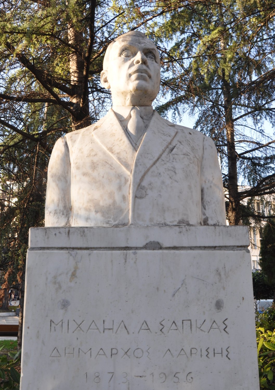 Στην Κεντρική Πλατεία της Λάρισας δεσπόζει η προτομή του Δημάρχου Μιχαήλ Σάπκα (1963), έργο του γλύπτη. Ο Μιχαήλ Σάπκας (Μεγάροβο, περιοχή Μοναστηρίου 1873 – Λάρισα 1956) ήταν Γιατρός, Πολιτικός και Δήμαρχος Λάρισας (1914-1917, 1925-1934), από τις κορυφαίες προσωπικότητες της πόλης. Ιδρυτής του Μακεδονικού Συλλόγου Λάρισας το 1901 και ένας από τους οργανωτές του σώματος των Μακεδονομάχων.