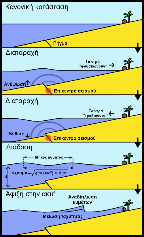 ΓΕΝΙΚΑ: Το τσουνάμι (ιαπωνικά: 津波, tsunami=κύμα στο λιμάνι1), είναι θαλάσσιο φαινόμενο, που δημιουργείται κατά την απότομη μετατόπιση μεγάλων ποσοτήτων υδάτων σε μια θάλλασσα ή σπανιότερα μέσα σε μια λίμνη. Το τσουνάμι εκδηλώνεται με τη μορφή κυμάτων, τα οποία, στα βαθιά νερά των ωκεανών, “ταξιδεύουν” με μέση ταχύτητα 210μ./δευτ. ή 756 χιλιομέτρων/ώρα! Διαδίδονται και οδεύουν με μήκος κύματος της τάξης των 50-400 χιλιομέτρων και ύψος που κυμαίνεται, συνήθως, από λίγα εκατοστά, έως 1 μέτρο και σπάνια έως 2, όταν βρίσκονται κοντά στην εστία δημιουργίας τους. Φτάνοντας τα κύματα αυτά σε ρηχά νερά χάνουν την ταχύτητά τους, έως και 20 φορές, αρχικά στο μπροστινό τους μέτωπο που φτάνει πρώτο στις ακτές, και έτσι το μήκος τους μικραίνει, καθώς το πίσω μέρος του κύματος ταξιδεύει ακόμη, με μεγαλύτερη ταχύτητα. Το μήκος του κύματος ενός τσουνάμι μεταβάλλεται, ακολουθώντας την μεταβολή της μέσης ταχύτητάς του σύμφωνα με το βάθος της θάλασσας που διατρέχει, ενώ η ορμή του διατηρείται με αντίστοιχη μεταβολή του ύψους του. Φτάνοντας στις ακτές το κύμα συμπιέζεται και κερδίζει σε ύψος, οπότε γίνεται καταστρεπτικό φθάνοντας στις ακτές, αφού το ύψος του διατηρείται και καθώς εισβάλλει στην ενδοχώρα! Η αρχική απότομη μετατόπιση του νερού, που προκαλεί τη γένεση ενός τσουνάμι, μπορεί να είναι αποτέλεσμα υποθαλάσσιου, συνήθως, σεισμού, που προκαλεί κατακόρυφη ανάταξη του βυθού, ή παραθαλάσσιας κατάρρευσης βουνοπλαγιάς ή ηφαιστείου, ακόμη και πτώσης μεγάλου μεγέθους ουράνιου σώματος στη θάλασσα [μετεωρίτης]. Ενώ σε βαθιά νερά το τσουνάμι, λόγω των χαρακτηριστικών του, δεν θεωρείται σοβαρός κίνδυνος για τα πλεούμενα, αντιθέτως, φτάνοντας στις ακτές έχει ιδιαίτερα καταστρεπτικές συνέπειες.