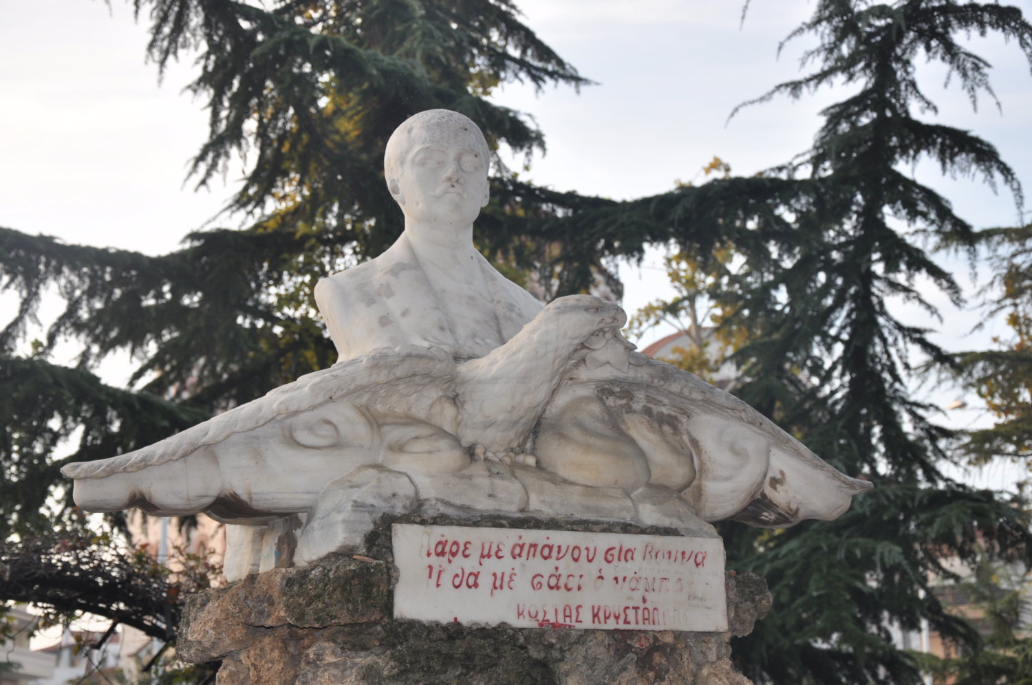 Σε προηγούμενες δημοσιεύσεις έγινε αναφορά στις 4 προτομές που κοσμούν το πάρκο και έχουν φιλοτεχνηθεί από τον γλύπτη Γεώργιο Καλακαλλά (παρουσιάστηκαν στο φύλλο της 5ης/3/2021) και στο Μνημείο της Εθνικής Αντίστασης, έργο του Φιλόλαου Τλούπα (παρουσιάστηκε στο φύλλο της 12ης/3/2021). Κατεβαίνοντας τα σκαλοπάτια της κύριας εισόδου του Πάρκου Αλκαζάρ αμέσως μετά τη γέφυρα του Πηνειού, στα αριστερά μας συναντούμε την προτομή του Κώστα Κρυστάλλη, με δημιουργό της τον Νικόλαο Γεωργαντή.