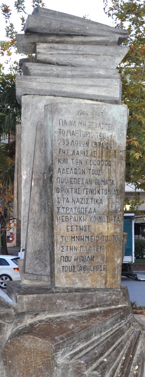 Δίπλα της ένας επιβλητικός κατακόρυφος όγκος-στήλη, αναφέρει το γεγονός: «1944-1945 ΓΙΑ ΝΑ ΜΗΝ ΞΕΧΑΣΤΕΙ ΤΟ ΜΑΡΤΥΡΙΟ ΤΩΝ 235 ΑΘΩΩΝ ΕΒΡΑΙΩΝ ΤΗΣ ΛΑΡΙΣΑΣ ΚΑΙ ΤΩΝ 6000000 ΑΔΕΛΦΩΝ ΤΟΥΣ ΠΟΥ ΕΠΕΣΑΝ ΘΥΜΑΤΑ ΦΡΙΧΤΗΣ ΓΕΝΟΚΤΟΝΙΑΣ ΣΤΑ ΝΑΖΙΣΤΙΚΑ ΣΤΡΑΤΟΠΕΔΑ Η ΕΒΡΑΪΚΗ ΚΟΙΝΟΤΗΤΑ ΕΣΤΗΣΕ ΤΟ ΜΝΗΜΕΙΟ ΤΟΥΤΟ ΣΤΗΝ ΠΛΑΤΕΙΑ ΠΟΥ Η ΠΟΛΗ ΤΟΥΣ ΑΦΙΕΡΩΣΕ». Σε ειδική κρύπτη στη βάση του μνημείου τοποθετήθηκε λήκυθος με κύλινδρο από λεπτό φύλλο χαλκού, που τυλίχτηκε σαν περγαμηνή, με χαραγμένα όλα τα ονόματα των Λαρισαίων Εβραίων που χάθηκαν στο Ολοκαύτωμα, κατά οικογένειες, καθιστώντας το μνημείο ταυτόχρονα και μνήμα για τη γενοκτονία. Η κοιλότητα κατόπιν σφραγίστηκε για να μείνουν τα ονόματα των θυμάτων στην ιστορία και να μην λησμονηθούν. Μπροστά από το μνημείο υπάρχει βαθμιδωτή κατασκευή, όπου ρέουν νερά που δημιουργούν μικρή λιμνούλα.