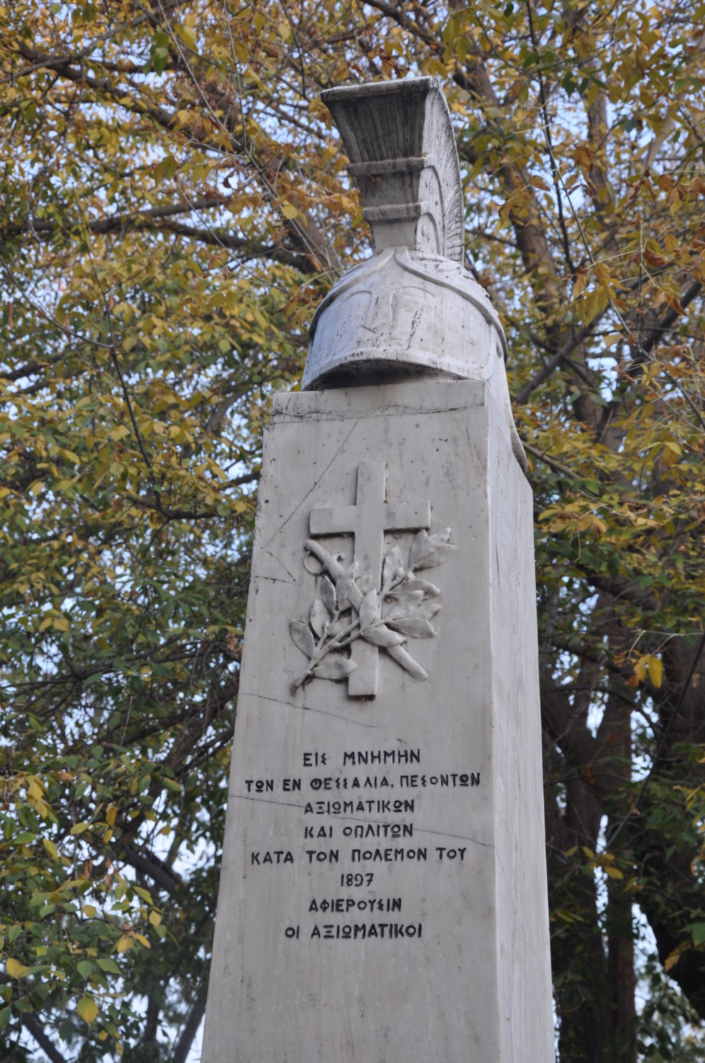 Το Μνημείο πεσόντων Αξιωματικών και Οπλιτών του 1897 – το παλαιό Ηρώο της Λάρισας, είναι μία μαρμάρινη αναθηματική στήλη, που ανεγέρθηκε προς τιμήν των πεσόντων κατά τη διάρκεια του ελληνοτουρκικού πολέμου του 1897. Το μνημείο σχεδίασε ο ταγματάρχης Σπυρ. Κλαυδιανός το 1907 και τα αποκαλυπτήρια πραγματοποιήθηκαν την άνοιξη του 1909, όταν το μνημείο μεταφέρθηκε από το εργαστήριο του γλύπτη και τοποθετήθηκε στον χώρο του Αλκαζάρ. Η μαρμάρινη μονολιθική, ψηλή στήλη εδράζεται σε υπερυψωμένο μαρμάρινο επίσης, τετράγωνο βάθρο σε μορφή βωμού, το οποίο με τη σειρά του στηρίζεται σε κρηπίδα δύο βαθμίδων. Πρόκειται για τυπικό δείγμα πεσσόσχημου ηρώου με κρηπίδα, που επιστέφεται από μαρμάρινη, αρχαιοπρεπή, διακοσμημένη περικεφαλαία με μικρό επιρρίνιο και πλούσιο λοφίο. Στις τέσσερις γωνίες του Ηρώου υπάρχουν αντίστοιχοι μαρμάρινοι πεσσίσκοι που συνδέονται μεταξύ τους με περίτεχνο μεταλλικό κιγκλίδωμα και οριοθετούν τον χώρο του μνημείου.