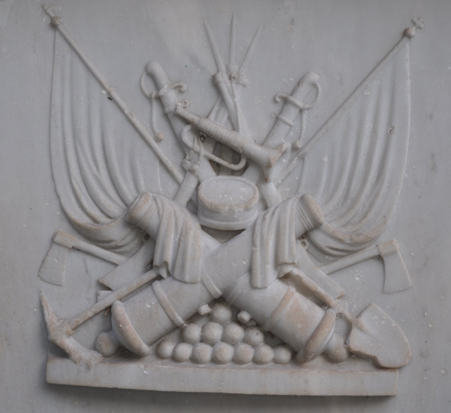 Δύο ανάγλυφα διακοσμούν την μπροστινή κύρια πλευρά της στήλης. Στο επάνω μέρος, κλάδος με φύλλα δάφνης και ξίφος πλαισιώνουν ανάγλυφο σταυρό, κάτω από τα οποία υπάρχει η εγχάρακτη επιγραφή: «ΕΙΣ ΜΝΗΜΗΝ ΤΩΝ ΕΝ ΘΕΣΣΑΛΙΑ ΠΕΣΟΝΤΩΝ ΑΞΙΩΜΑΤΙΚΩΝ ΚΑΙ ΟΠΛΙΤΩΝ ΚΑΤΑ ΤΟΝ ΠΟΛΕΜΟΝ ΤΟΥ 1897 ΑΦΙΕΡΟΥΣΙΝ ΟΙ ΑΞΙΩΜΑΤΙΚΟΙ». Στο βάθρο της στήλης ένα αρκετά έξεργο ανάγλυφο παραπέμπει στο πεδίο της μάχης: κανόνια με τις σιδερένιες οβίδες σε σχηματισμό πυραμίδας, ξίφη και τυφέκια με ξιφολόγχες, σάλπιγγα, σημαίες σε κοντάρια με σταυρό, πηλήκιο και εργαλεία (αξίνα, φτυάρι και τσεκούρια). Στη βάση της στήλης και στο εμπρόσθιο μέρος διακρίνεται η εγχάρακτη υπογραφή του γλύπτη: Γ. ΞΕΝΑΚΗΣ ΕΠΟΙΕΙ. Το Ηρώο του Αλκαζάρ αποτέλεσε το παλαιό Ηρώο της Λάρισας, μέχρι που κατασκευάσθηκε το σημερινό επίσημο Ηρώο.