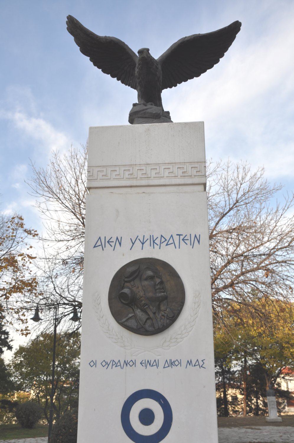 Μέσα στον χώρο του πάρκου του Φρουρίου, με το πράσινο και τα ψηλά δέντρα, παραπλεύρως του Ηρώου της πόλης της Λάρισας, προβάλλει επιβλητική μαρμάρινη στήλη-μνημείο από μάρμαρο, ύψους 5 μ., αφιερωμένη στη μνήμη των Πεσόντων Αεροπόρων υπέρ της πατρίδος στους αγώνες του έθνους. Φιλοτεχνήθηκε το 2007 στο μαρμαρογλυφείο του Αριστ. Κούτρη σε συνεργασία με τον γλύπτη Στάθη Αλεξόπουλο και στήθηκε με εισήγηση-επιμέλεια του Αρχηγείου Τακτικής Αεροπορίας με μέριμνα των Τοπικής Ένωσης Απόστρατων Αξιωματικών Αεροπορίας και χορηγό το ΓΕΑ. Στο ανώτερο τμήμα του μνημείου σε ομοίωμα βράχου στέκεται ορειχάλκινος αετός με ανοιγμένα τα φτερά του. Χαμηλότερα το ψηλό μαρμάρινο βάθρο περιτρέχει ανάγλυφος μαίανδρος και στην μπροστινή όψη, ανάμεσα στις δύο εγχάρακτες φράσεις «ΑΙΕΝ ΥΨΙΚΡΑΤΕΙΝ» και «ΟΙ ΟΥΡΑΝΟΙ ΕΙΝΑΙ ΔΙΚΟΙ ΜΑΣ» παρεμβάλλεται ένθετο ορειχάλκινο μετάλλιο, πλαισιωμένο από φύλλα δάφνης με ανάγλυφη τη μορφή αεροπόρου με στρατιωτική ενδυμασία, να ατενίζει τον ορίζοντα. Το υπερυψωμένο αυτό βάθρο στηρίζεται σε τετράγωνο μαρμάρινο βάθρο σε μορφή βωμού, κι αυτό με τη σειρά του σε κρηπίδα. Το μνημείο αποτελεί δωρεά του Εφέδρου Αξιωματικού Νικολάου Χατζηευθυμίου, μαχητού του Αποσπάσματος Δαβάκη και του 4ου Συν/τος Πεζικού Λαρίσης.