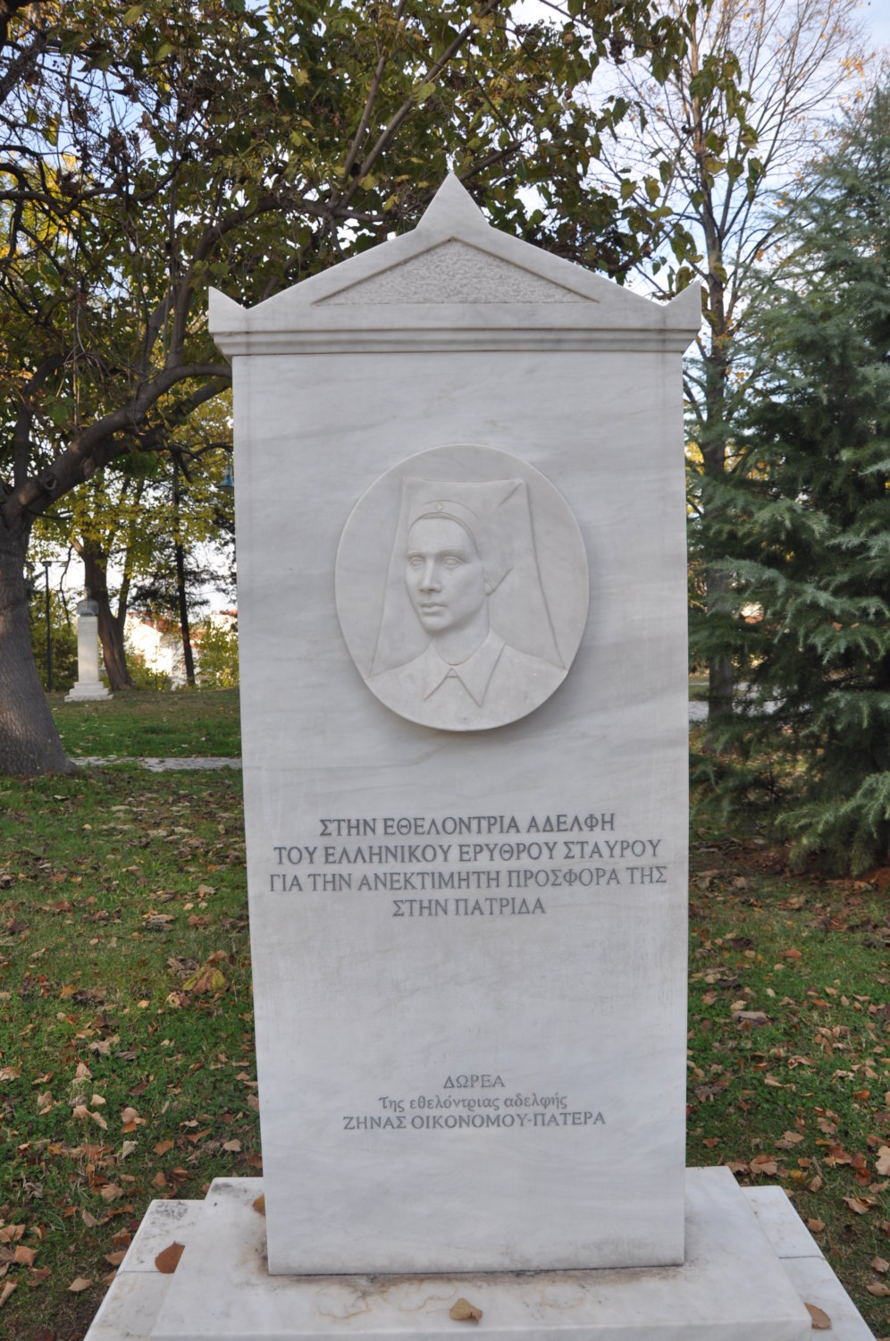 Η στήλη της Εθελόντριας Αδελφής του Ελληνικού Ερυθρού Σταυρού φιλοτεχνήθηκε επίσης από τους Αριστοτέλη Κούτρη και Στάθη Αλεξόπουλο. Πρόκειται για μαρμάρινη στήλη με αετωματική απόληξη, η οποία εδράζεται σε κρηπίδα δύο βαθμίδων. Αποτελεί δωρεά της Εθελόντριας Αδελφής Ζήνας Οικονόμου-Πατέρα και όπως αναγράφεται στην μπροστινή πλευρά της στήλης, είναι αφιερωμένη «ΣΤΗΝ ΕΘΕΛΟΝΤΡΙΑ ΑΔΕΛΦΗ ΤΟΥ ΕΛΛΗΝΙΚΟΥ ΕΡΥΘΡΟΥ ΣΤΑΥΡΟΥ ΓΙΑ ΤΗΝ ΑΝΕΚΤΙΜΗΤΗ ΠΡΟΣΦΟΡΑ ΤΗΣ ΣΤΗΝ ΠΑΤΡΙΔΑ». Σε μετάλλιο αποδίδεται ανάγλυφα η μορφή της Εθελόντριας Αδελφής με την ενδυμασία του Ερυθρού Σταυρού.