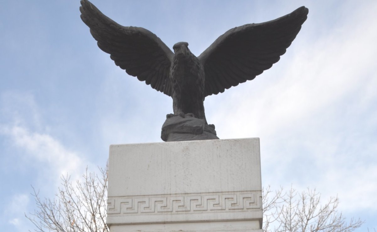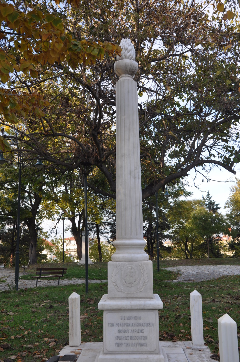 Μέσα στον χώρο του πάρκου του Φρουρίου, με το πράσινο και τα ψηλά δέντρα, παραπλεύρως του Ηρώου της πόλης της Λάρισας, προβάλλει επιβλητική μαρμάρινη στήλη-μνημείο από μάρμαρο, ύψους 5 μ., αφιερωμένη στη μνήμη των Πεσόντων Αεροπόρων υπέρ της πατρίδος στους αγώνες του έθνους. Φιλοτεχνήθηκε το 2007 στο μαρμαρογλυφείο του Αριστ. Κούτρη σε συνεργασία με τον γλύπτη Στάθη Αλεξόπουλο και στήθηκε με εισήγηση-επιμέλεια του Αρχηγείου Τακτικής Αεροπορίας με μέριμνα των Τοπικής Ένωσης Απόστρατων Αξιωματικών Αεροπορίας και χορηγό το ΓΕΑ. Στο ανώτερο τμήμα του μνημείου σε ομοίωμα βράχου στέκεται ορειχάλκινος αετός με ανοιγμένα τα φτερά του. Χαμηλότερα το ψηλό μαρμάρινο βάθρο περιτρέχει ανάγλυφος μαίανδρος και στην μπροστινή όψη, ανάμεσα στις δύο εγχάρακτες φράσεις «ΑΙΕΝ ΥΨΙΚΡΑΤΕΙΝ» και «ΟΙ ΟΥΡΑΝΟΙ ΕΙΝΑΙ ΔΙΚΟΙ ΜΑΣ» παρεμβάλλεται ένθετο ορειχάλκινο μετάλλιο, πλαισιωμένο από φύλλα δάφνης με ανάγλυφη τη μορφή αεροπόρου με στρατιωτική ενδυμασία, να ατενίζει τον ορίζοντα. Το υπερυψωμένο αυτό βάθρο στηρίζεται σε τετράγωνο μαρμάρινο βάθρο σε μορφή βωμού, κι αυτό με τη σειρά του σε κρηπίδα. Το μνημείο αποτελεί δωρεά του Εφέδρου Αξιωματικού Νικολάου Χατζηευθυμίου, μαχητού του Αποσπάσματος Δαβάκη και του 4ου Συν/τος Πεζικού Λαρίσης.