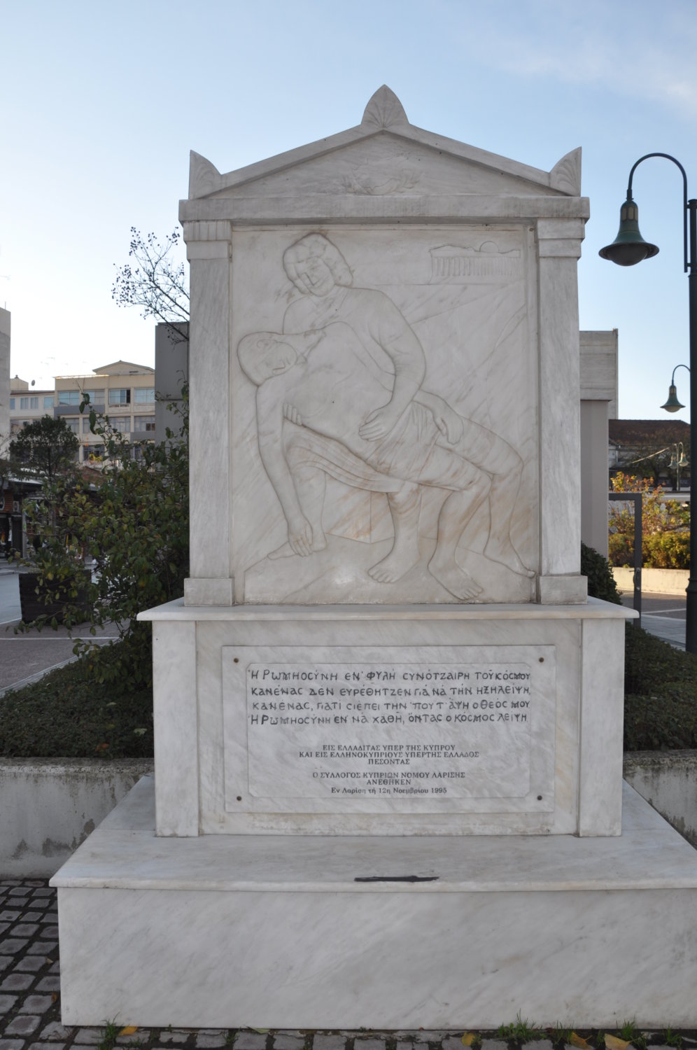 Στην πλατεία Πλατεία Αγαμέμνονα Μπλάνα ή Πλατεία Νέας Αγοράς ή Πλατεία Λαού συναντούμε το Μνημείο των πεσόντων Ελλαδιτών και Ελλήνων Κυπρίων. Πρόκειται για μαρμάρινη στήλη με αετωματική απόληξη και ακροκέραμα στην κορυφή και τις γωνίες (κατά το αρχαιοελληνικό πρότυπο), που εδράζεται σε ψηλό μαρμάρινο βάθρο κι αυτό με τη σειρά του σε μαρμάρινη βάση. Στο βάθρο, κάτω από ποίημα για τη Ρωμιοσύνη, αναγράφεται: «ΕΙΣ ΕΛΛΑΔΙΤΑΣ ΥΠΕΡ ΤΗΣ ΚΥΠΡΟΥ ΚΑΙ ΕΙΣ ΕΛΛΗΝΟΚΥΠΡΙΟΥΣ ΥΠΕΡ ΤΗΣ ΕΛΛΑΔΟΣ ΠΕΣΟΝΤΑΣ. Ο ΣΥΛΛΟΓΟΣ ΚΥΠΡΙΩΝ ΝΟΜΟΥ ΛΑΡΙΣΗΣ ΑΝΕΘΗΚΕΝ Εν Λαρίση τη 12η Νοεμβρίου 1995». Απεικονίζεται ανάγλυφα γυναικεία μορφή να κρατά το νεκρό σώμα ενός άνδρα, ενώ στο βάθος υπάρχει η απεικόνιση αρχαίου ναού και πανσελήνου. Στον τριγωνικό χώρο του αετώματος ανάγλυφα απεικονίζεται η νήσος Κύπρος, την οποία πλαισιώνει δάφνινο στεφάνι.
