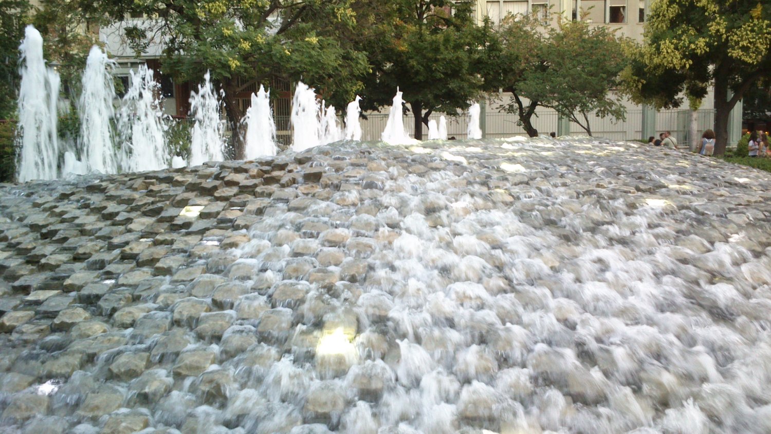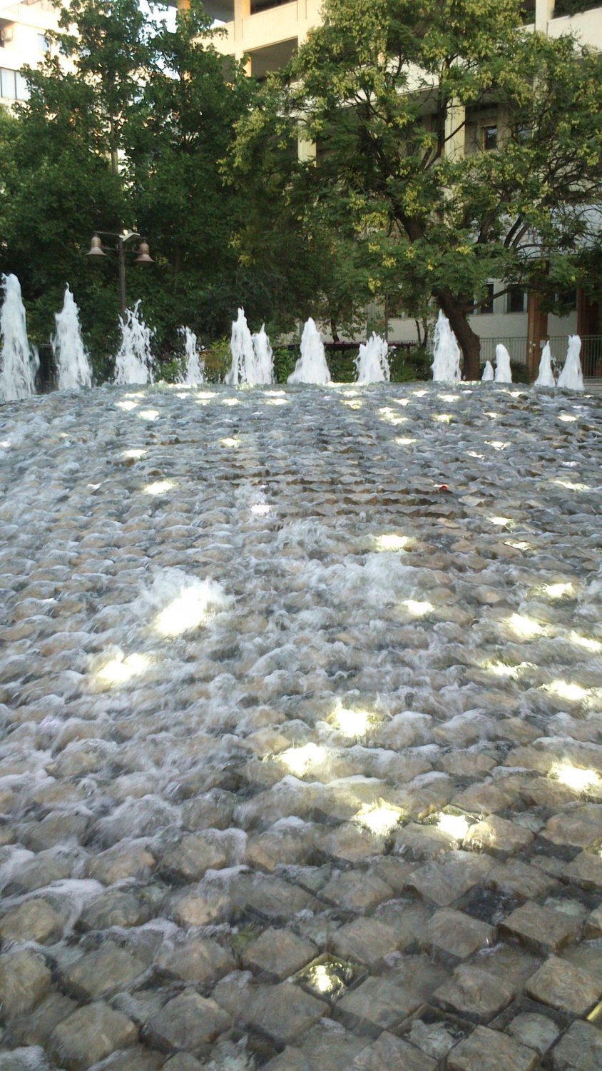 Το έργο συνεχίζεται στην Κεντρική Πλατεία. Το ποτάμι εμφανίζεται σε όλο του το μεγαλείο στο σιντριβάνι (1995-1998), στην πεδινή του πλέον ανάπτυξη. Μετά την πτώση του νερού με ένταση από τους ορεινούς όγκους (στην Πλατεία Ταχυδρομείου), εμφανίζεται εκ νέου το ποτάμι, το οποίο ο θεσσαλικός κάμπος αφήνει να ξεδιπλωθεί ήρεμα. Ο φωτισμός στο σιντριβάνι με τα δεκάδες φώτα τη νύχτα, θυμίζει οικισμό, παρατηρούμενο από μακριά. Ο θεατής οδηγείται στο επόμενο τμήμα του έργου – ένα αρχαιολογικό σκάμμα με δίχωρο κτίσμα με δόμους, που παραπέμπει σε αρχαίο ναό. Οι διάδρομοι της πλατείας οδηγούν προς το Α΄ Αρχαίο Θέατρο, πλαισιωμένοι από φώτα που θυμίζουν κολώνες τηλεφώνου ή ηλεκτρικού. Ο σχεδιασμός του πλακόστρωτου μιμείται διατάξεις φυτεύσεων των χωραφιών και σιδηρόδρομους.
