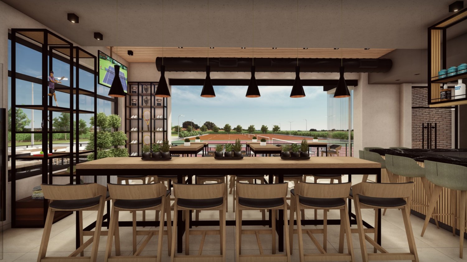 Επίσης διαθέτει εξωτερική βεράντα με θέα τα γήπεδα, ένα καταπράσινο περιβάλλον που είναι το κατάλληλο μέρος για να περιμένετε τα παιδιά μετά την προπόνηση.