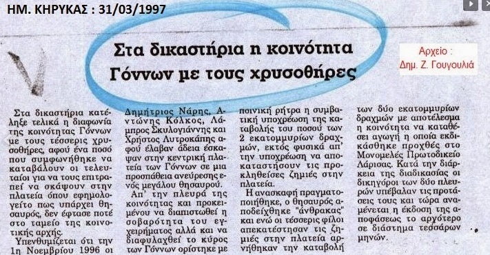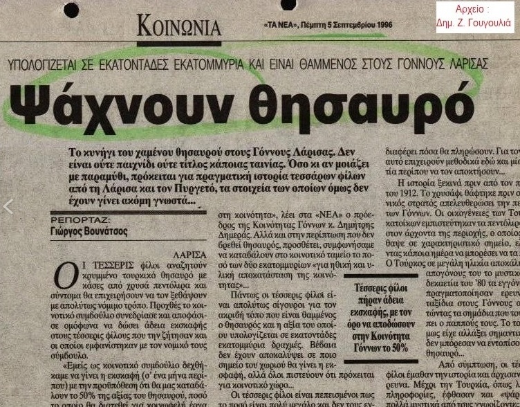 Πρώτη στάση γίνεται στην πλατεία των Γόννων εκεί όπου τον Νοέμβρη του 1996, φτάνουν μπουλντόζες για να σκάψουν έχοντας λάβει όμως νωρίτερα την απαραίτητη έγκριση της τότε κοινότητας. Ο Τύπος της εποχής (εφημερίδες: Ημερήσιος Κήρυκας και Ελευθερία) ανέφεραν μεταξύ άλλων πως η υπόθεση αφορούσε σε 4 χρυσοθήρες που είχαν ως πρόθεση να σκάψουν στην πλατεία του χωριού ψάχνοντας για κάσες από χρυσά πεντόλιρα. Όλα, σύμφωνα με εκείνα τα δημοσιεύματα άρχισαν προτού ο ελληνικός στρατός απελευθερώσει την περιοχή των Γόννων από τον τουρκικό ζυγό. Τότε, οι οικογένειες των Τούρκων που έμεναν στην περιοχή αποφάσισαν να εμπιστευτούν τα πεντόλιρά τους στον άρχοντα της περιοχής. Εκείνος, ανέφεραν οι πληροφορίες και εν συνεχεία τα δημοσιεύματα, φέρεται να τα έθαψε σε κάποιο σημείο και πάντα όμως πίστευε πως θα μπορούσε κάποια στιγμή να επιστρέψει για να τα πάρει.