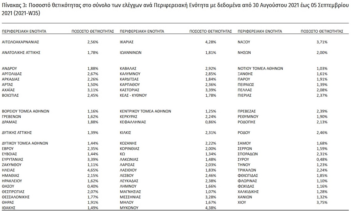 Την εβδομάδα 30 Αυγούστου 2021 – 05 Σεπτεμβρίου 2021 (2021-W35) το ποσοστό θετικότητας ήταν 2.78% σε σύνολο 622.394 εργαστηριακών ελέγχων (RT-PCR/Rapid-Ag) και 0.81% σε σύνολο 527.566 αυτοδιαγνωστικών ελέγχων.
