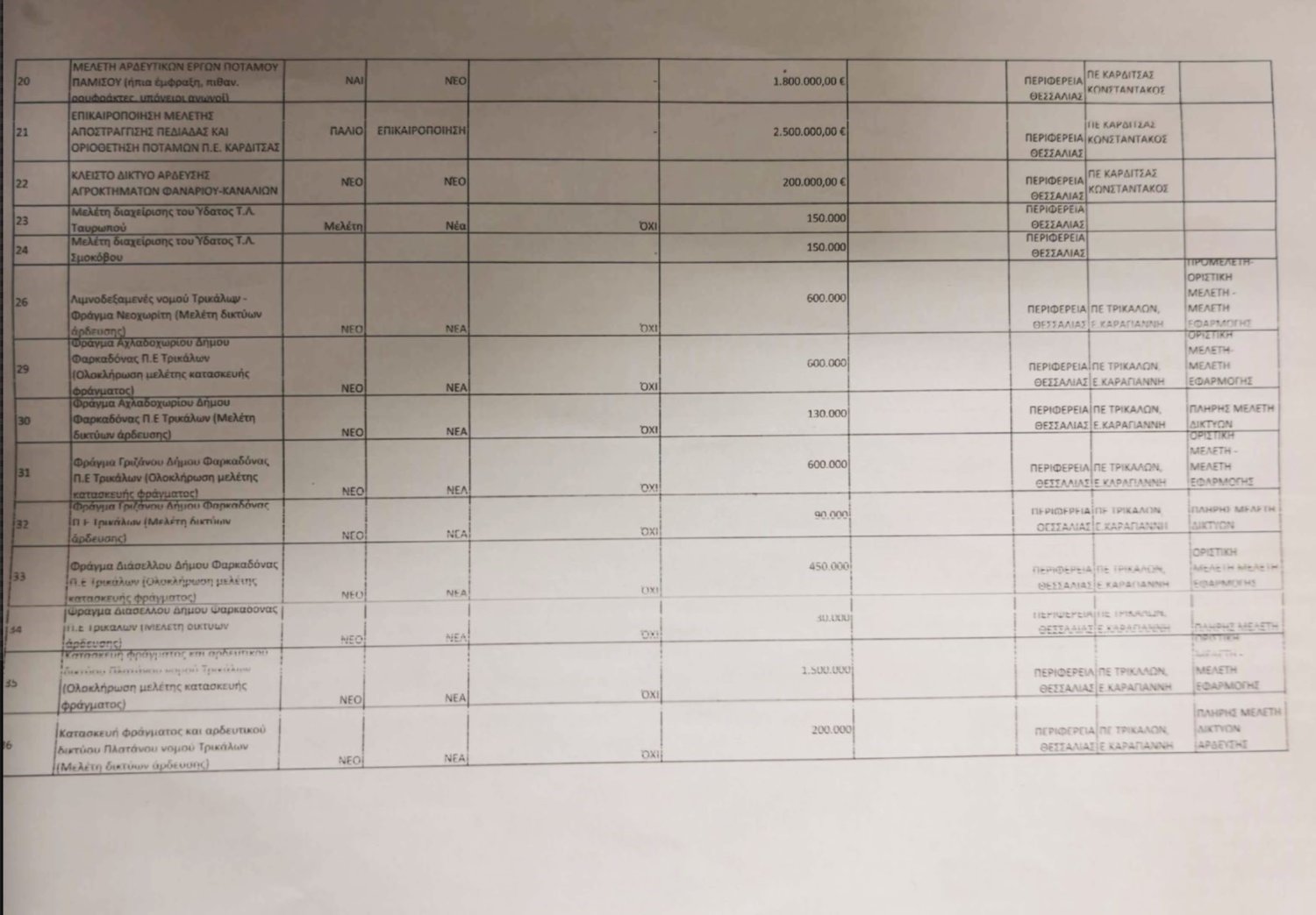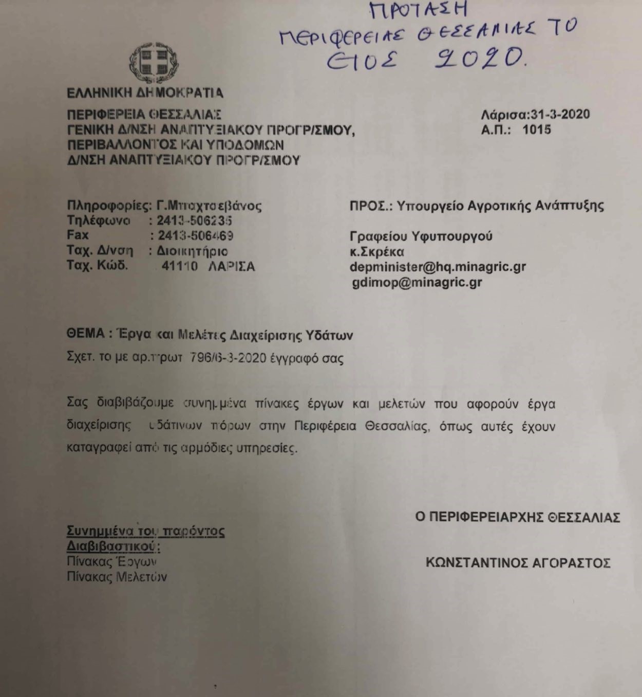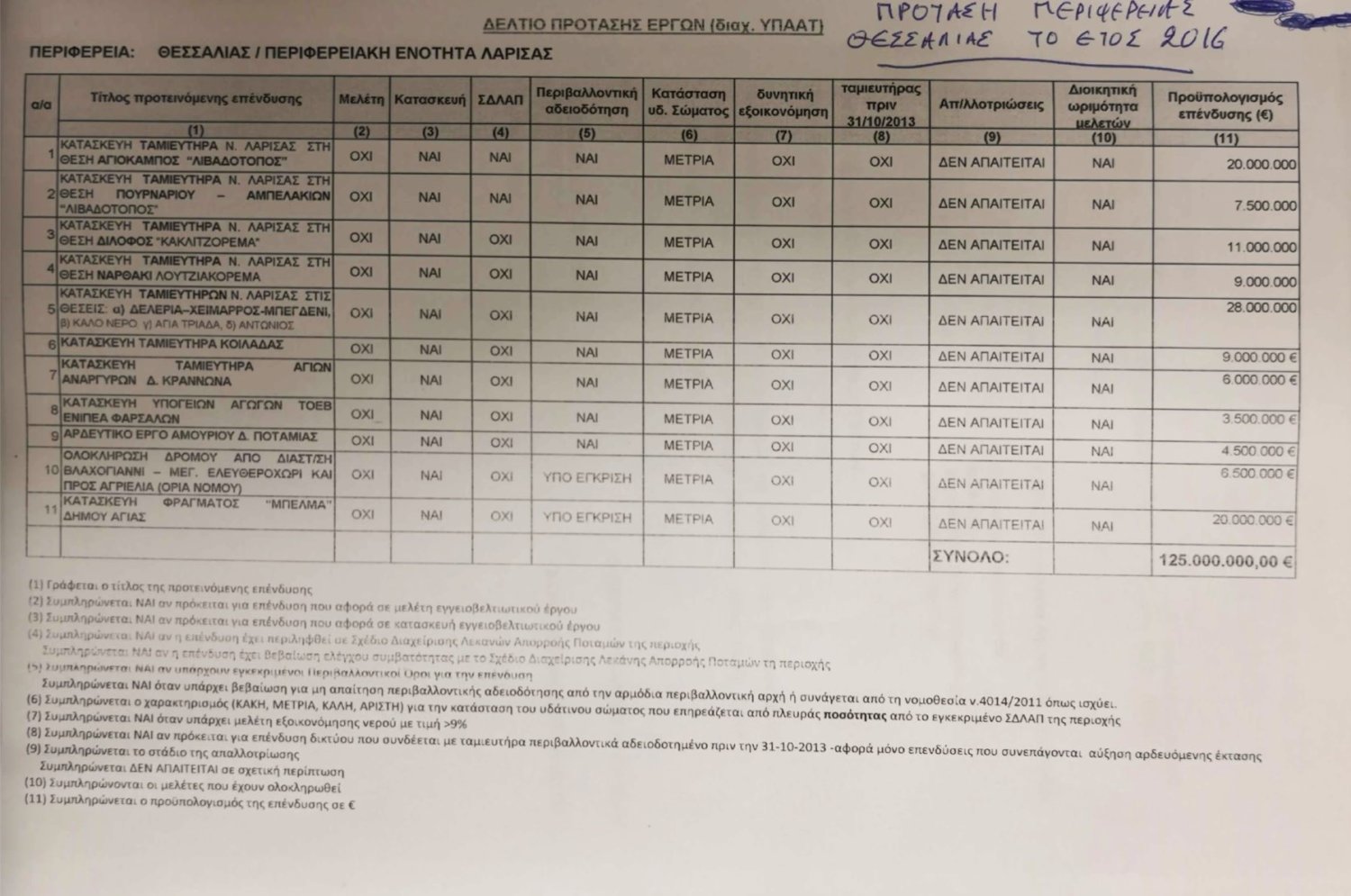 Στις 18-05-2018 ζητήθηκε εκ νέου από το ΥΠΑΑΤ η υποβολή των Δικαιολογητικών των προτάσεων (σχετικό το με αρ.πρωτ.: 771/15-05-2018 έγγραφο ΥΠΑΑΤ), ΑΠΟΥΣΙΑΖΕΙ όμως από την πρόταση της Περιφέρειας ΘΕΣΣΑΛΙΑΣ το έργο φράγμα: Σκοπιάς Φαρσάλων, όπως φαίνεται από τον σχετικό πίνακα της πρότασης.