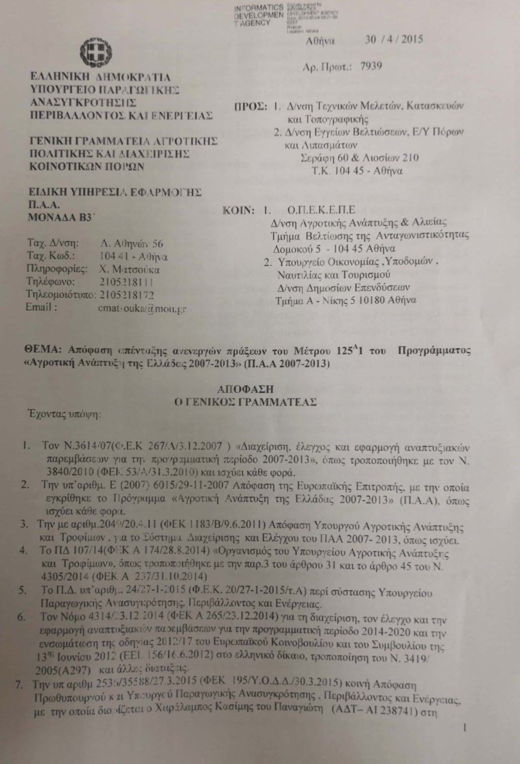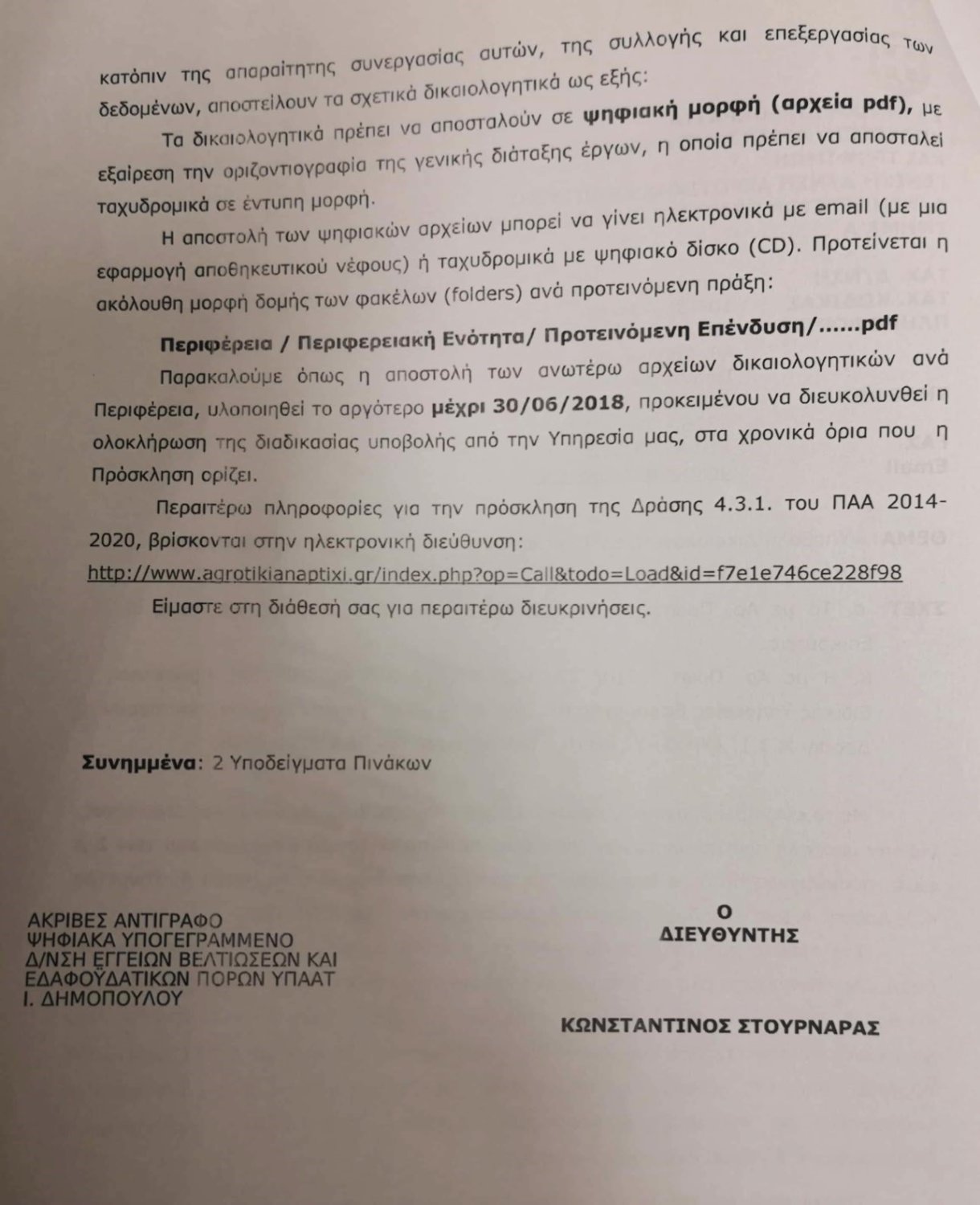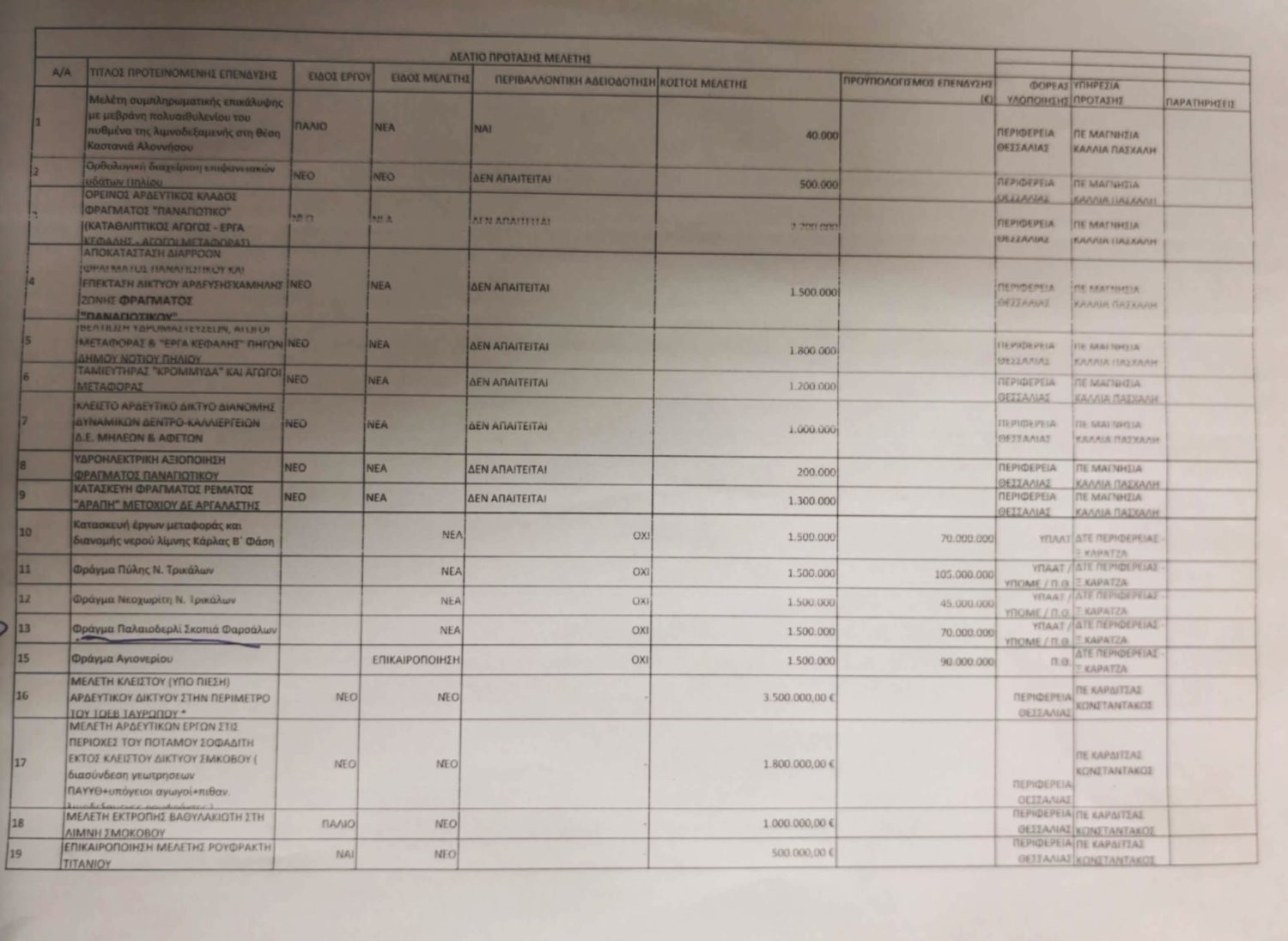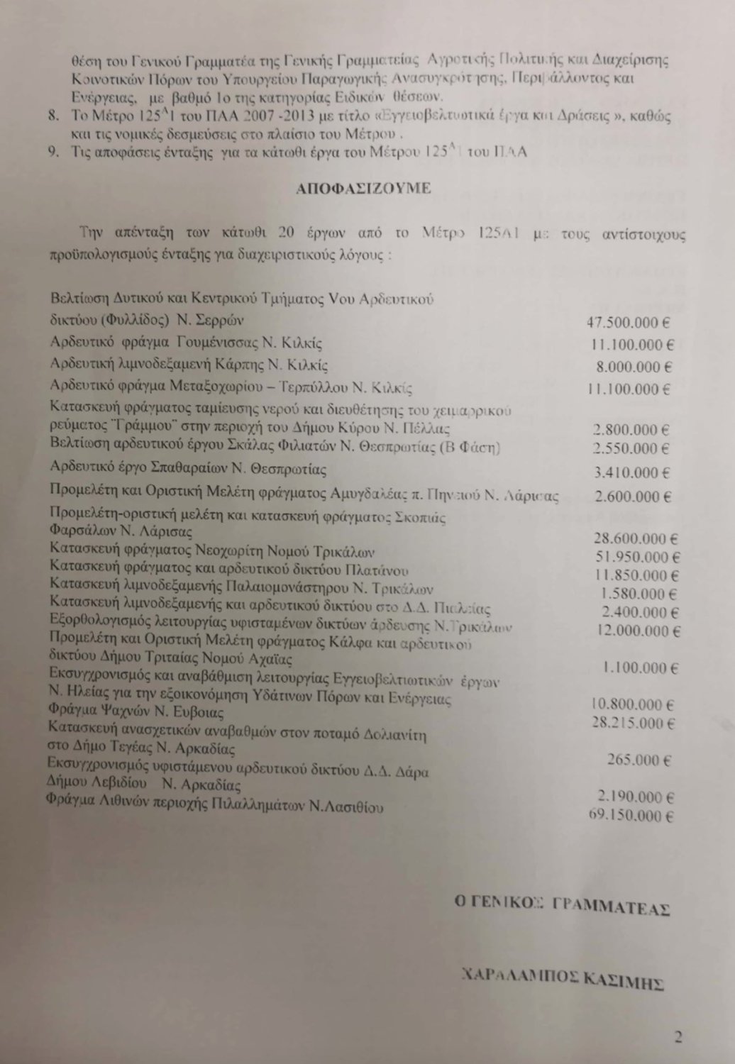 Στις 18-05-2018 ζητήθηκε εκ νέου από το ΥΠΑΑΤ η υποβολή των Δικαιολογητικών των προτάσεων (σχετικό το με αρ.πρωτ.: 771/15-05-2018 έγγραφο ΥΠΑΑΤ), ΑΠΟΥΣΙΑΖΕΙ όμως από την πρόταση της Περιφέρειας ΘΕΣΣΑΛΙΑΣ το έργο φράγμα: Σκοπιάς Φαρσάλων, όπως φαίνεται από τον σχετικό πίνακα της πρότασης.