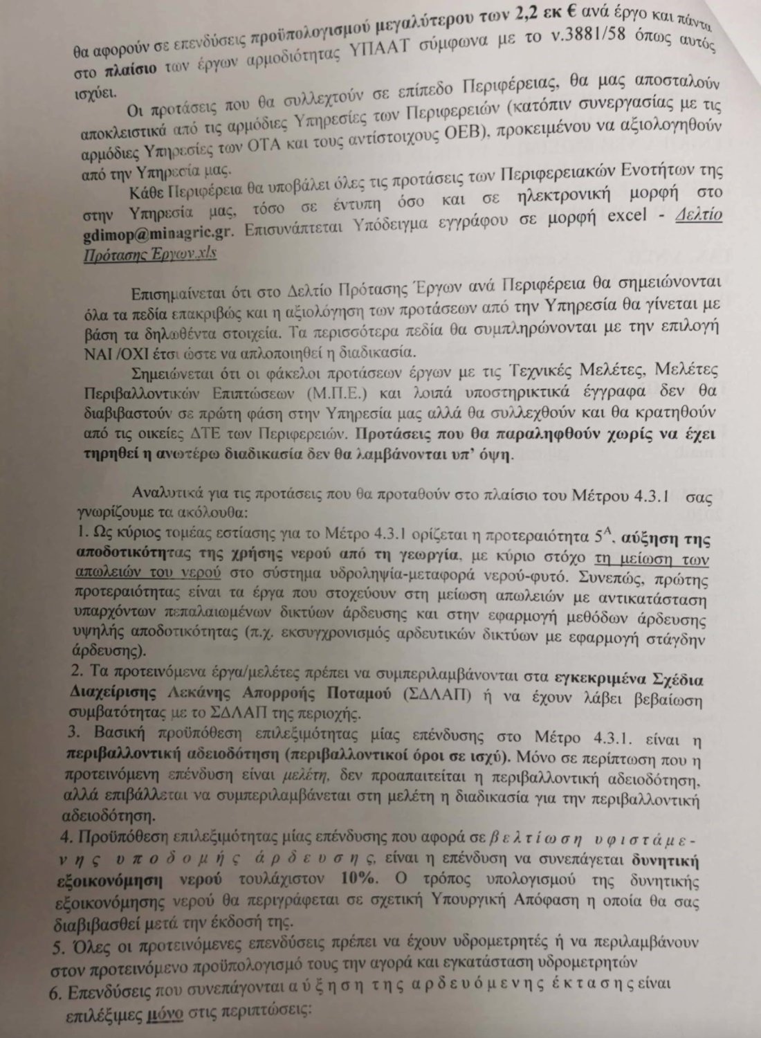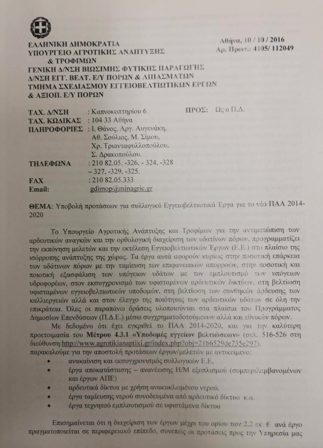 Εν συνεχεία εν όψει του ΠΑΑ 2014-2020 ζητήθηκε εκ μέρους του ΥΠΑΑΤ από την ΠΕΡΙΦΕΡΕΙΑ ΘΕΣΣΑΛΙΑΣ (όπως και από τις υπόλοιπες Περιφέρειες) στις 10-10-2016 (αρ. πρωτ: 4105/112049) η υποβολή προτάσεων για έργα αρδευτικά στα πλαίσια του Μέτρου 4.3.1 «Υποδομές Εγγείων και Βελτιώσεων».