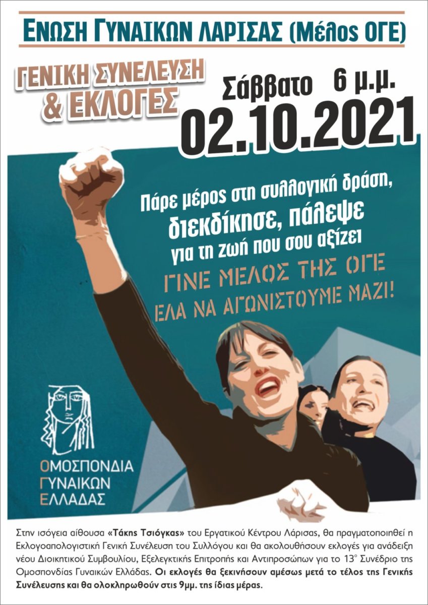Το Διοικητικό Συμβούλιο της Ένωσης Γυναικών Λάρισας (μέλος ΟΓΕ) ανακοινώνει «ότι το Σάββατο 2 Οκτωβρίου, στις 6μμ, στην ισόγεια αίθουσα «Τάκης Τσιόγκας» του Εργατικού Κέντρου Λάρισας, θα πραγματοποιηθεί η Εκλογοαπολογιστική Γενική Συνέλευση του Συλλόγου και θα ακολουθήσουν εκλογές για ανάδειξη νέου Διοικητικού Συμβουλίου, Εξελεγκτικής Επιτροπής και Αντιπροσώπων για το 13ο Συνέδριο της Ομοσπονδίας Γυναικών Ελλάδας. Οι εκλογές θα ξεκινήσουν αμέσως μετά το τέλος της Γενικής Συνέλευσης και θα ολοκληρωθούν στις 9μμ. της ίδιας μέρας.