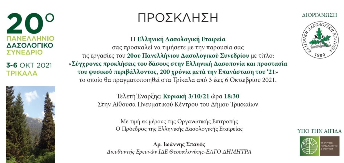 Ένα σημαντικό επιστημονικό συνέδριο, στον απόηχο των πυρκαγιών του φετινού καλοκαιριού, διεξάγεται στα Τρίκαλα. Πρόκειται για το 20ο Πανελλήνιο Δασολογικό Συνέδριο, που θα διεξαχθεί το διάστημα 3 – 6 Οκτωβρίου 2021 στο Πνευματικό Κέντρο Δήμου Τρικκαίων «Αθανάσιος Τριγώνης» και στην αίθουσα συνεδριάσεων του Δημοτικού Συμβουλίου του Δήμου Τρικκαίων.